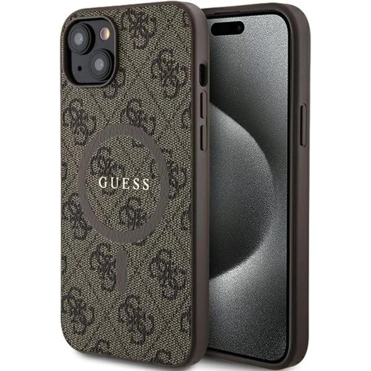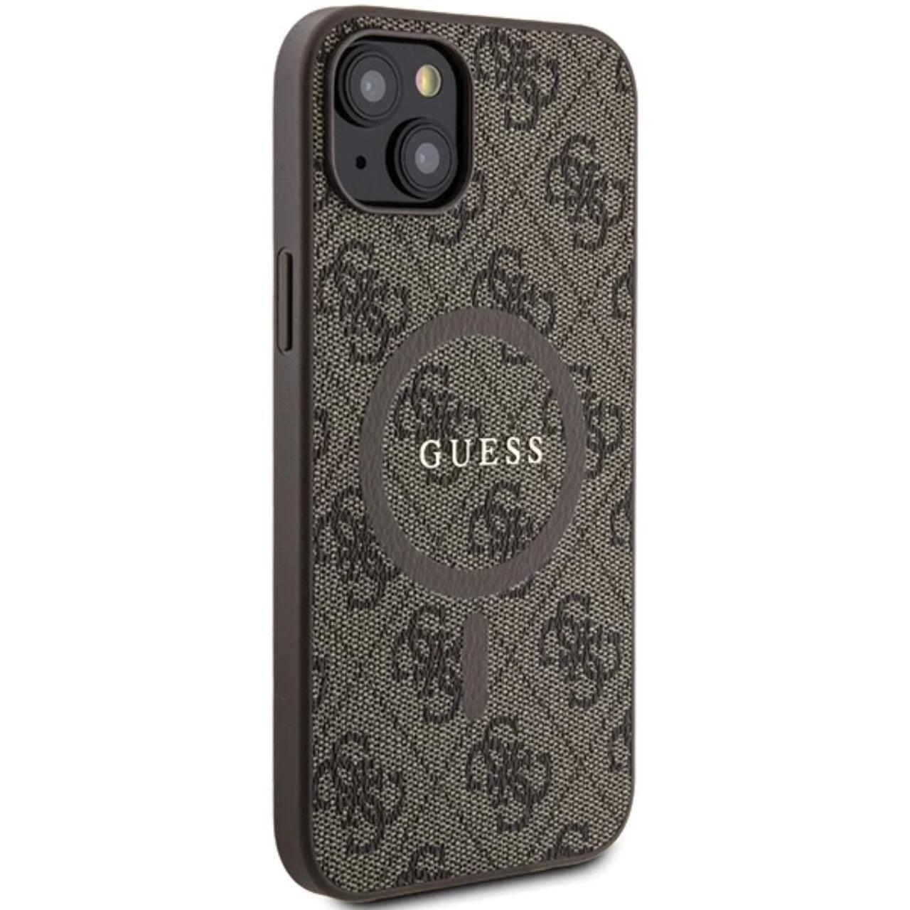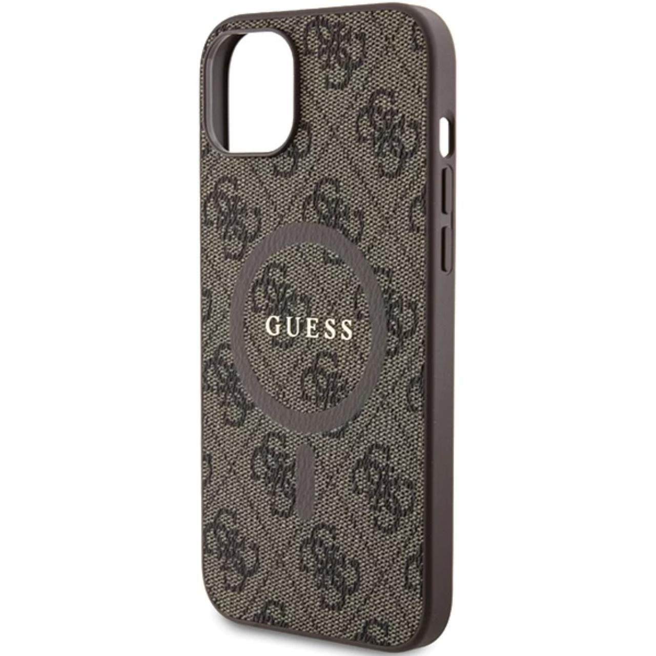 Custodia Guess in pelle PU 4G anello colorato MagSafe iPhone 15 Marrone