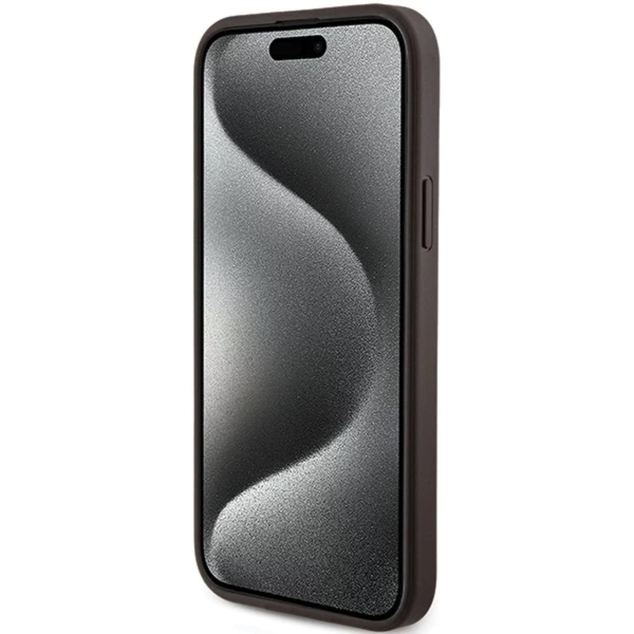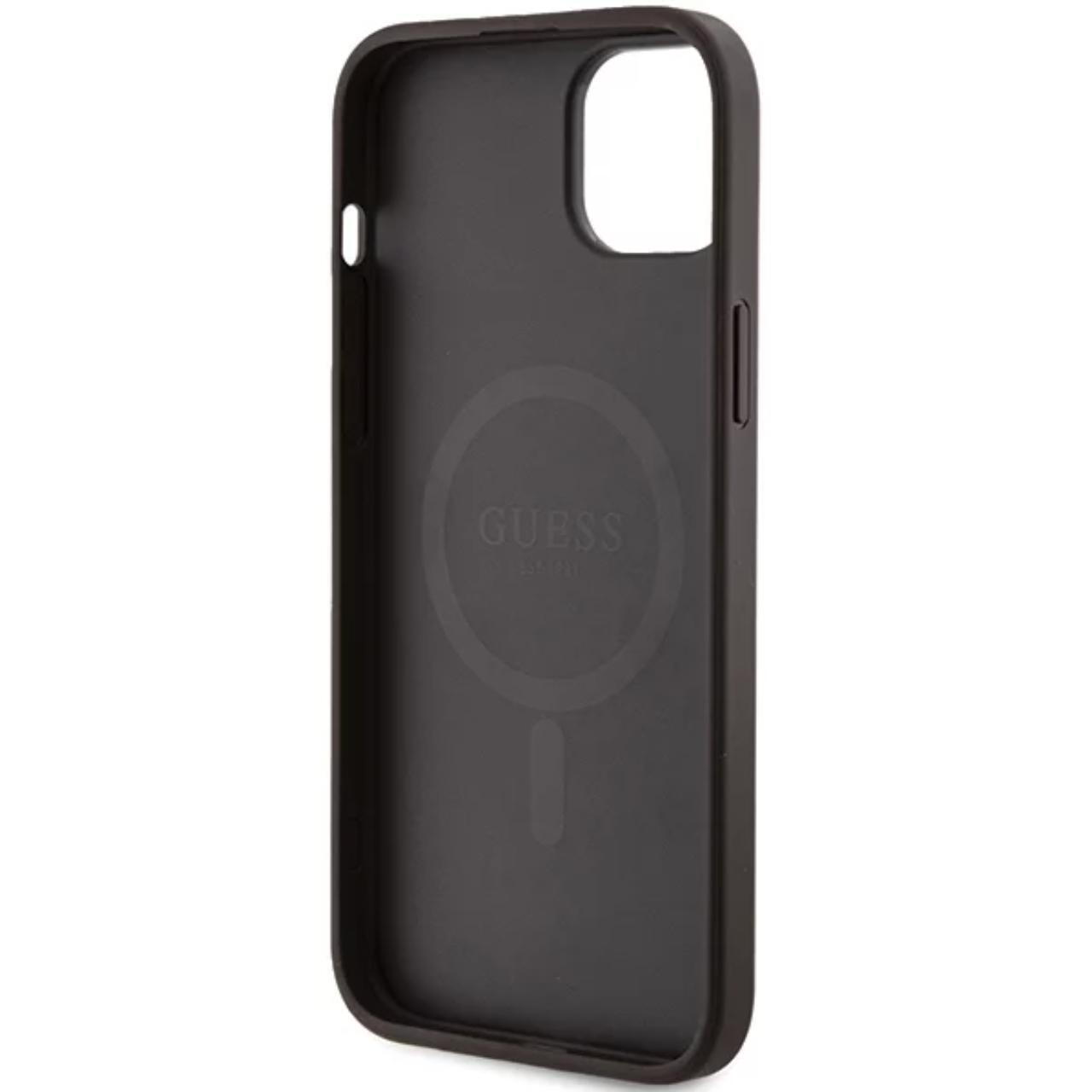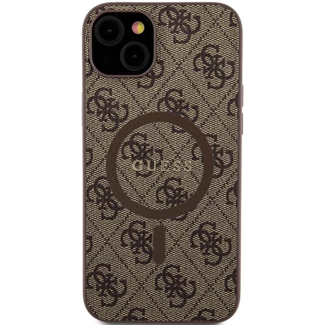 Custodia Guess in pelle PU 4G anello colorato MagSafe iPhone 15 Marrone