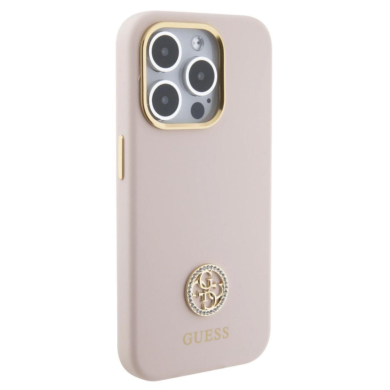Custodia Guess in silicone liquido 4G Logo in metallo strass iPhone 15 Pro Max Rosa