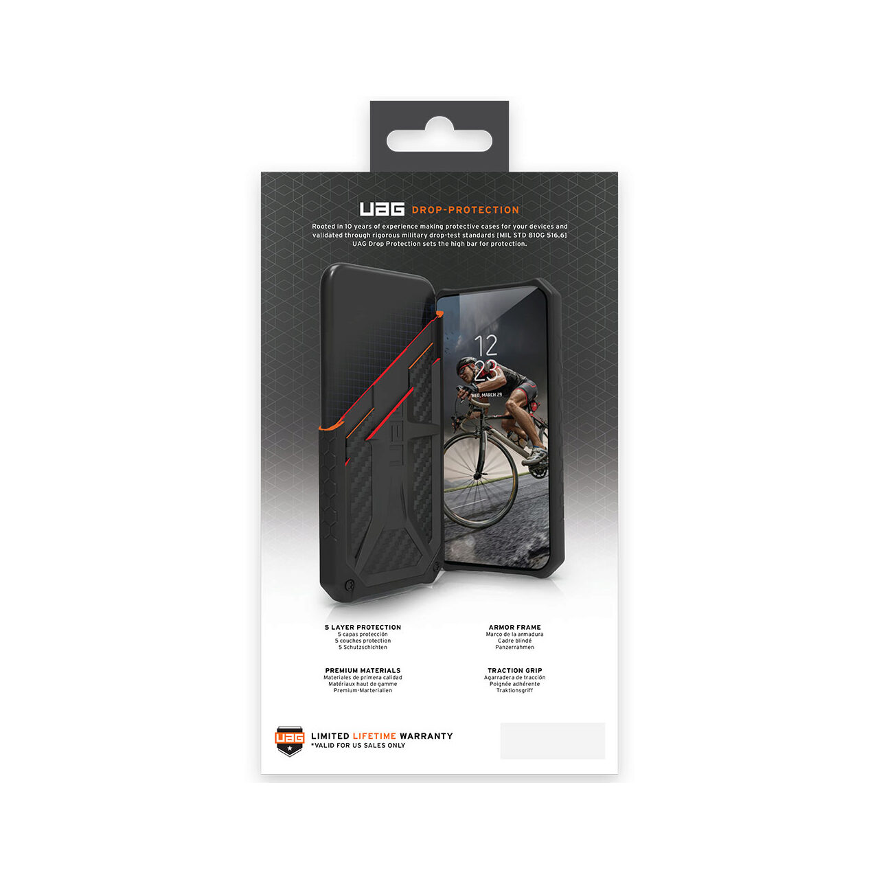 Custodia della serie Monarch per Samsung Galaxy S22 Plus di UAG combina 5 tipi di materiali in una protezione premium che resiste a cadute e graffi accidentali. I bordi e l'interno sono realizzati in gomma flessibile e gli angoli sono evidenziati e rinforzati per assorbire con successo gli urti. Sul retro è rinforzato con una copertura in plastica dura (policarbonato) in rilievo che rivela un'altra copertura in fibra di carbonio premium, il tutto saldamente fissato con l'aiuto di viti in lega metallica. Soddisfa gli standard di protezione MIL STD 810G 516.6 testati contro le cadute militari contro urti e gocce d'acqua. È una protezione molto leggera nonostante l'aspetto massiccio, ed il design è particolare sia per l'accostamento di più materiali che per le specifiche finiture UAG. La copertina è robusta, strutturata sul retro e sui bordi, offrendo una migliore presa nella mano. Dispone di ritagli precisi per le porte e le funzionalità del telefono in modo che possa essere utilizzato senza rimuovere la cover. I pulsanti sono rivestiti in materiale morbido e disegnati in rilievo per una migliore protezione e utilizzo. La custodia ha un profilo sottile ed è compatibile con la ricarica wireless e Apple Pay. Si monta/smonta facilmente dal telefono grazie ai bordi flessibili.I bordi intorno lo schermo e attorno alle fotocamere sono leggermente rialzati per una protezione extra quando il telefono è posizionato su una superficie piana. Caratteristiche: