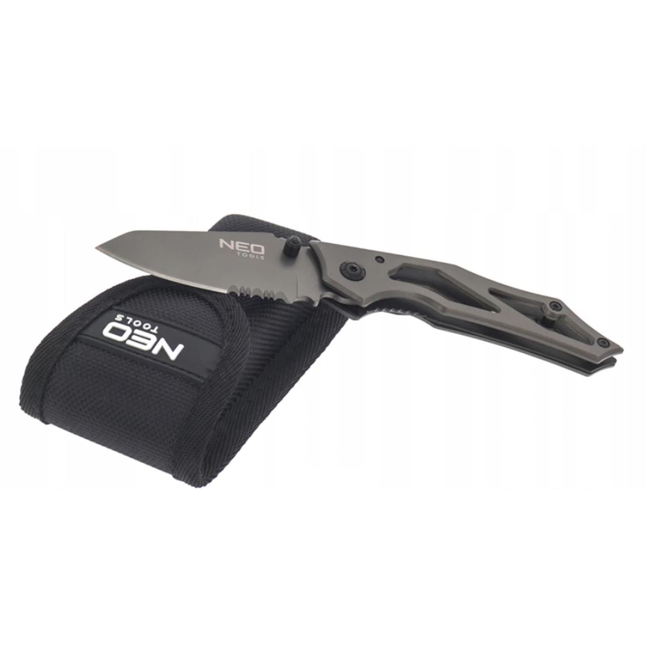 NEO folding knife with 440 steel locking blade and 7 cm length. The titanium body ensures the long life of the instrument. The lock protects against unintentional closing and provides safety at the workplace. The durable nylon case allows for easy storage and transportation. The NEO brand meets the expectations of professionals.