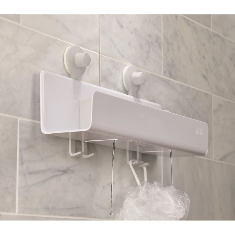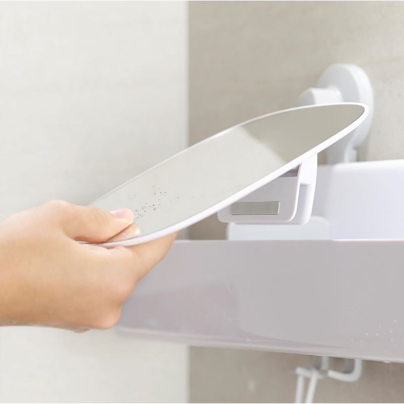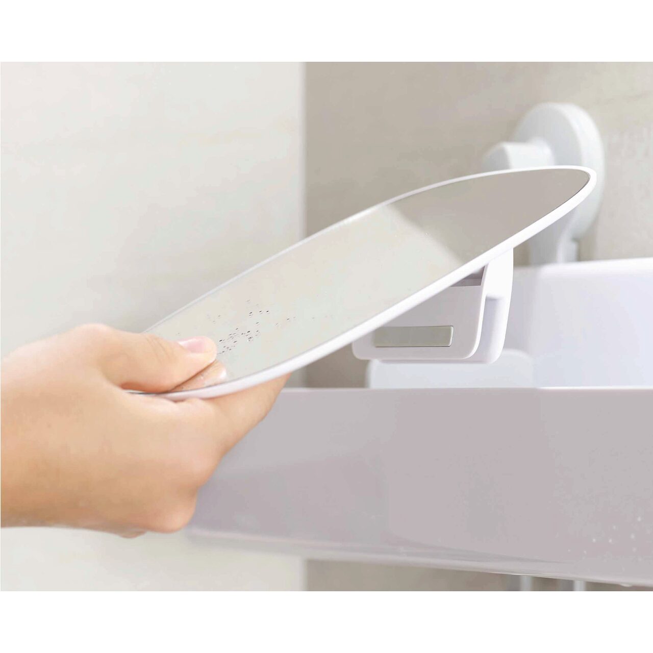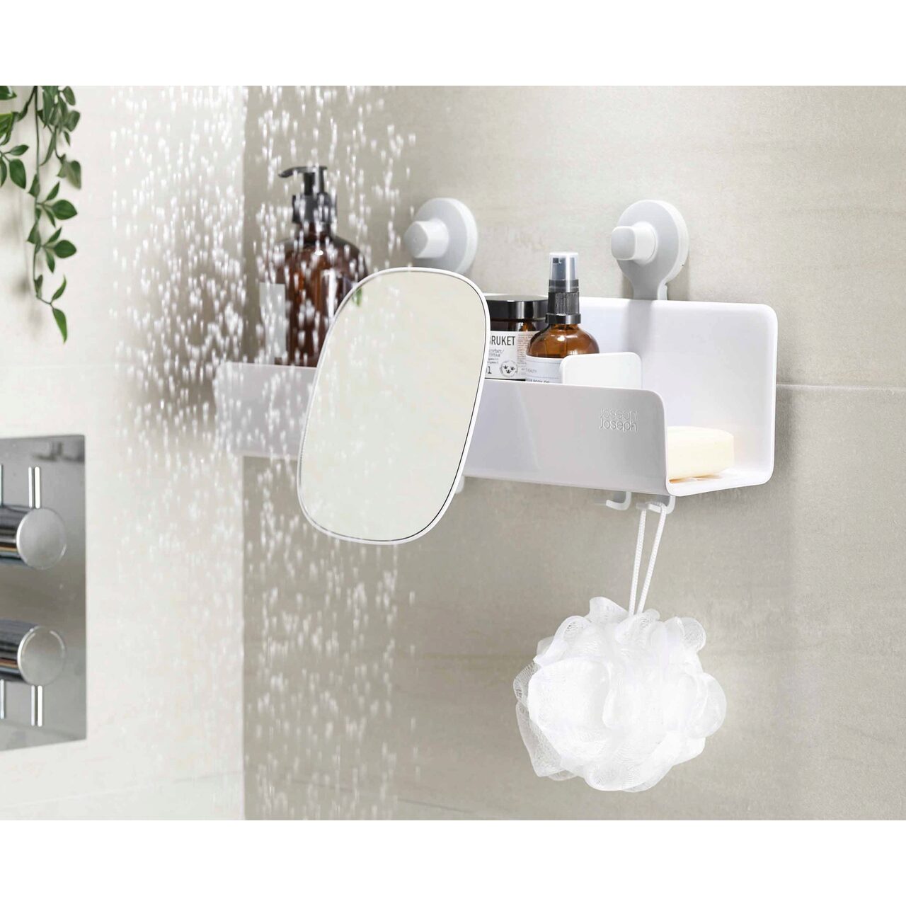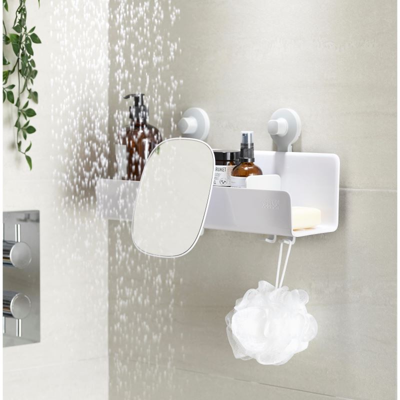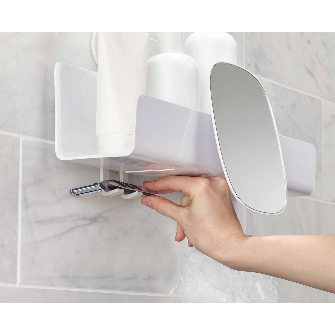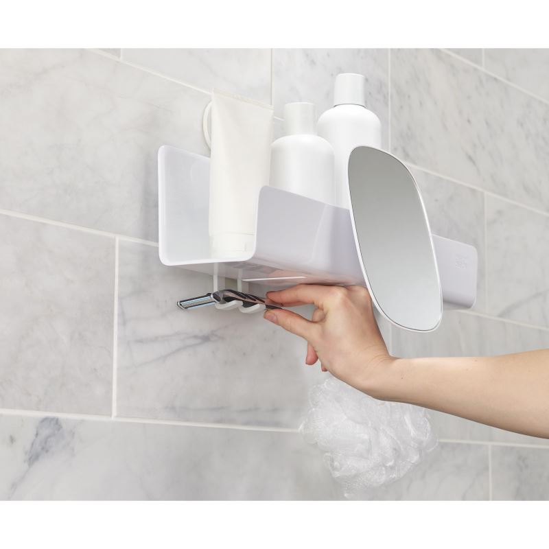 This shower rack takes the hassle out of storage with a self-draining design, hooks for razors, sponges and flannels, and an articulated, removable, shatter-resistant acrylic mirror.