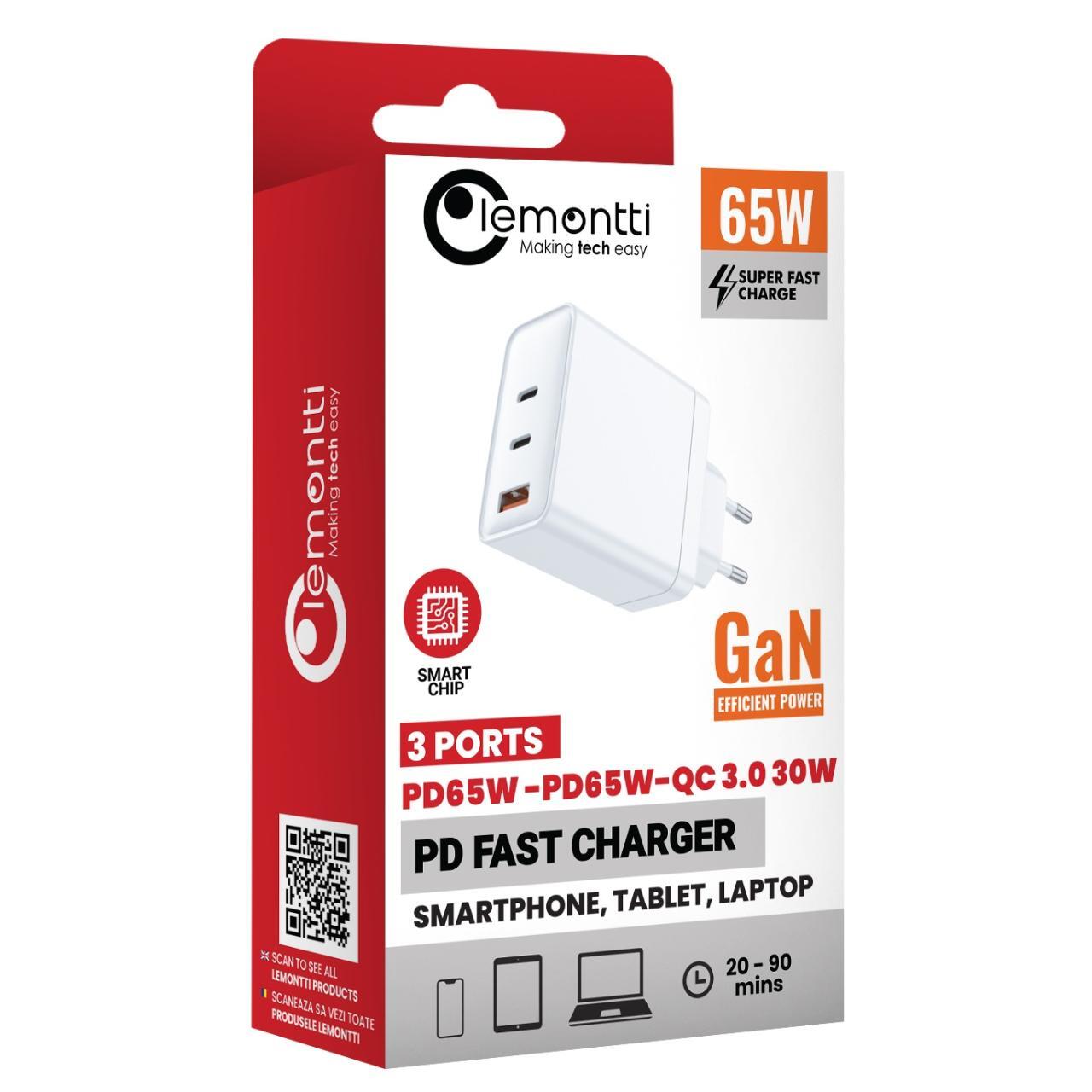 Lemontti GaN Network Charger 2x Type-C and 1x USB-A, 65W, Fast Charge, EU Plug, White