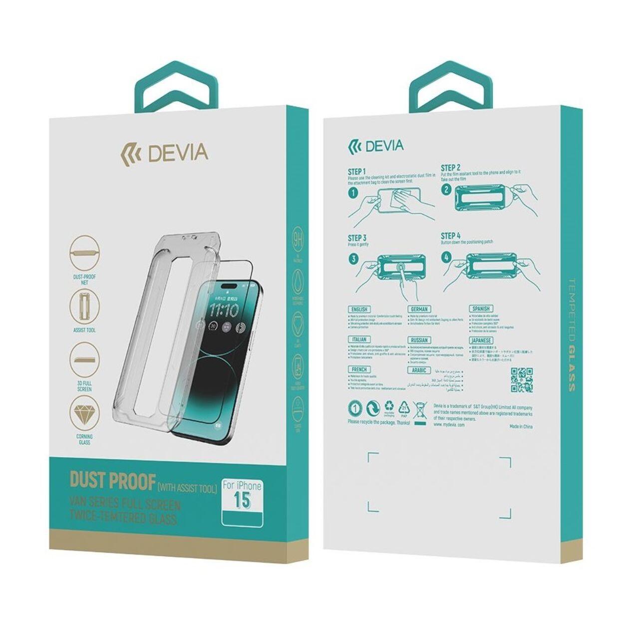 Devia Folie Glass Van-serie Ultradunne iPhone 15 op volledig scherm, met transparante montagekit