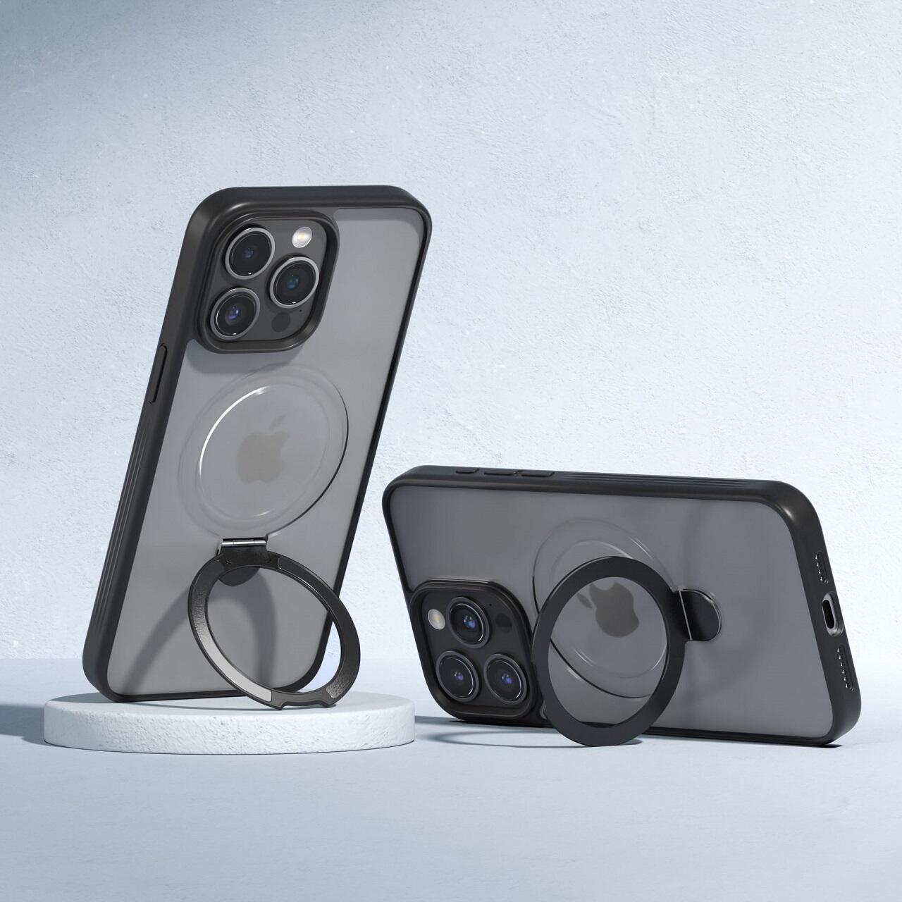 Husa Delight -serie Magnetic voor iPhone 15 Pro van Devia Het is gemaakt van harde pc op de achterkant en zachte bumper TPU aan de zijkant. De afwerking van deze case is mat (volwassen rug), dus de vingerafdrukken blijven niet gemakkelijk blijven. Met een gemakkelijke maar duurzame aluminiumlegering brengt de cirkelvormige ondersteuning de draagbaarheid van de case naar een nieuw niveau, bovendien kan het stabiel zijn in portret of landschapsmodus. En een zacht gevoel, en de hoge randen beschermen het scherm en de camera op de platte oppervlakken. Thermoplastisch