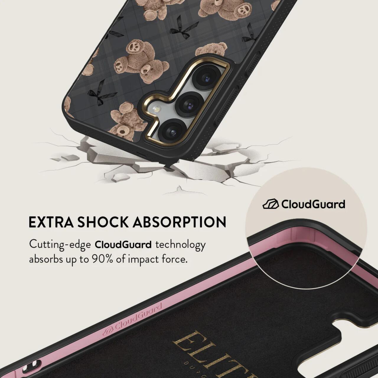 De Elite Gold-hoes voor de Samsung Galaxy S25 van Burga is voorzien van CloudGuard-technologie die bescherming biedt tegen beschadigingen en is ontworpen voor schokabsorptie en verdediging. Terwijl de harde buitenkant beschermt tegen krassen en vallen, dempt de TPU-siliconen binnenlaag de telefoon door tot 90% van de impact te absorberen.