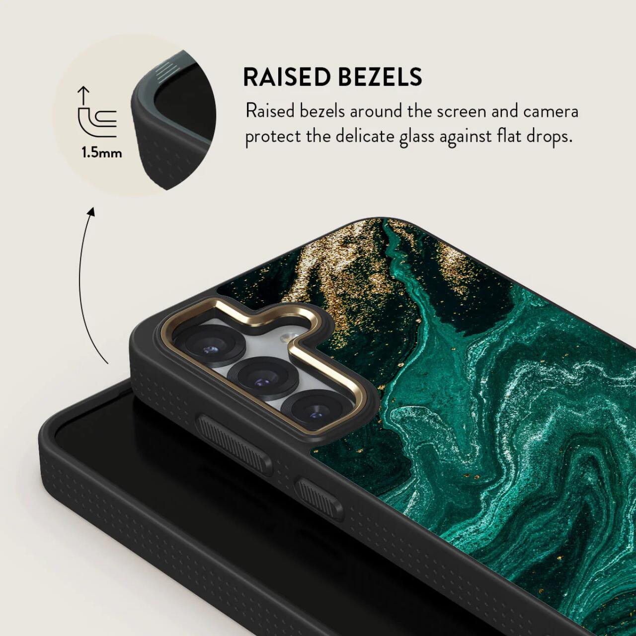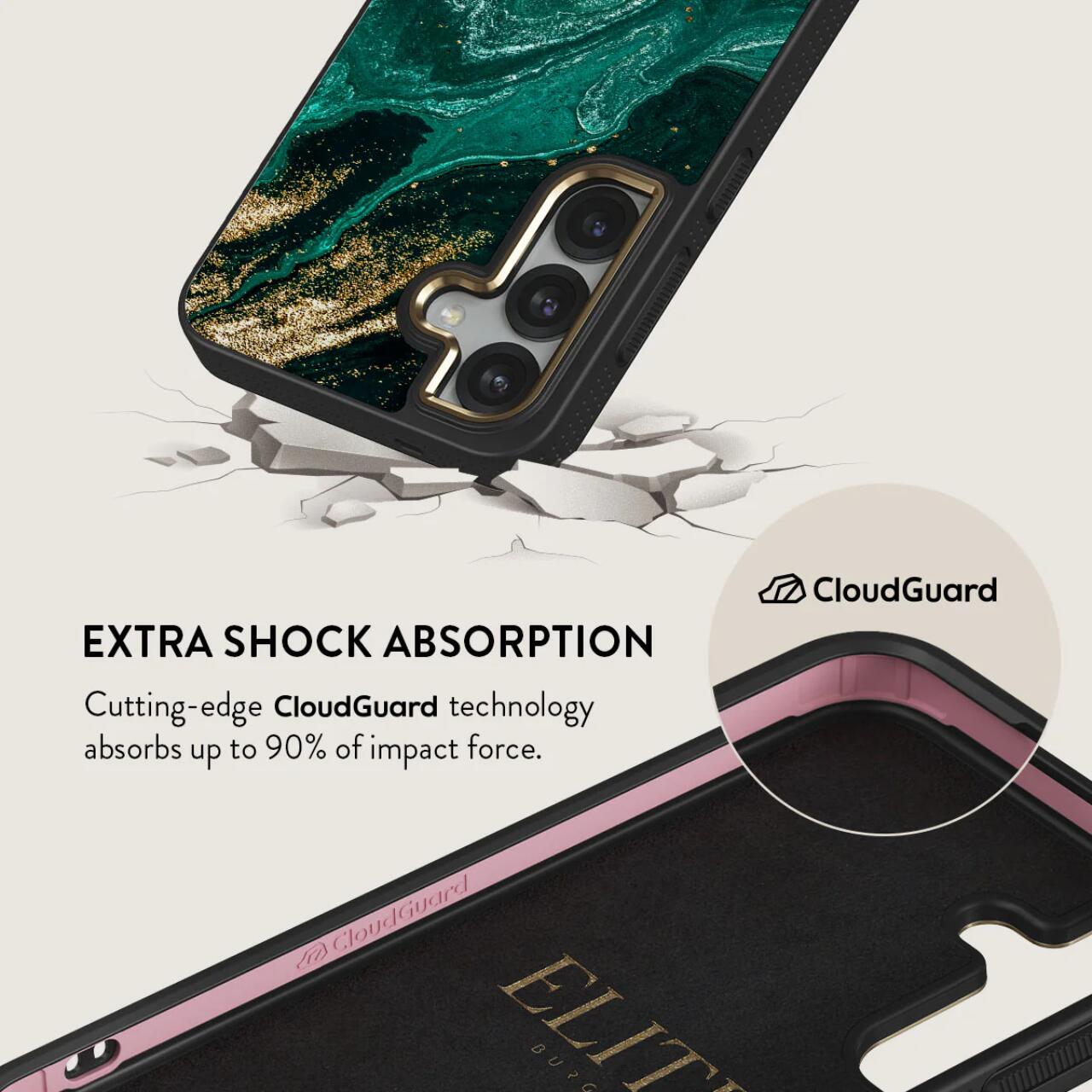 De Elite Gold Emerald Pool Case voor Samsung Galaxy S25 van Burga is voorzien van CloudGuard-technologie die bescherming biedt tegen schade en is ontworpen voor schokabsorptie en verdediging. Terwijl de harde buitenkant beschermt tegen krassen en vallen, dempt de TPU-siliconen binnenlaag de telefoon door tot 90% van de impact te absorberen.