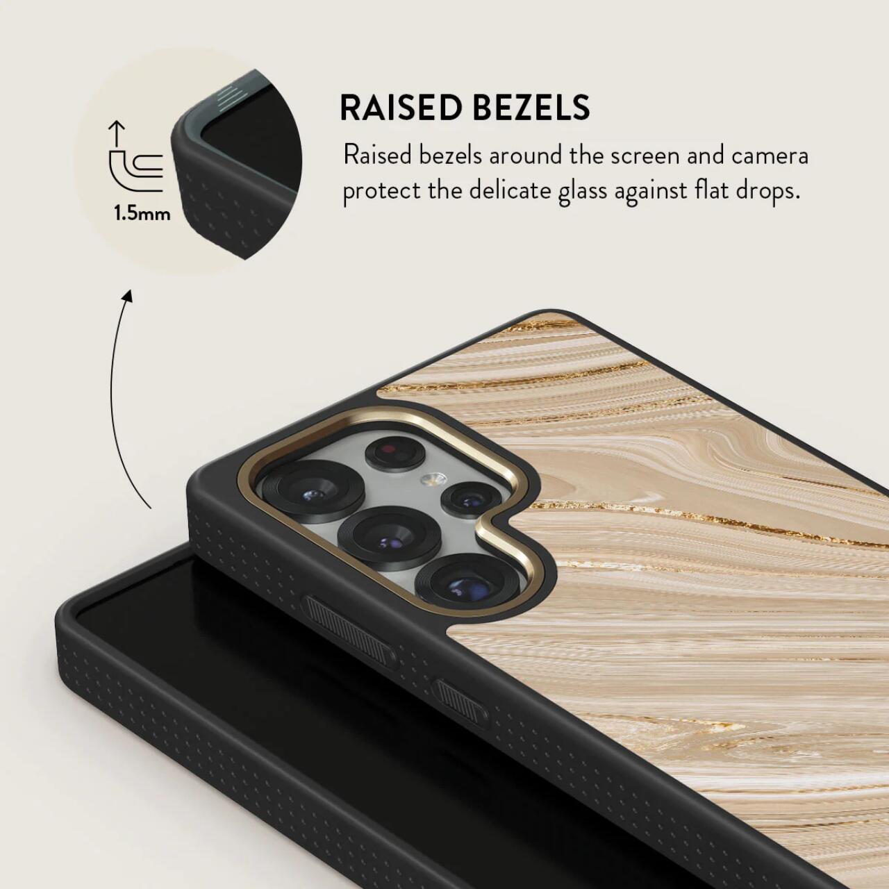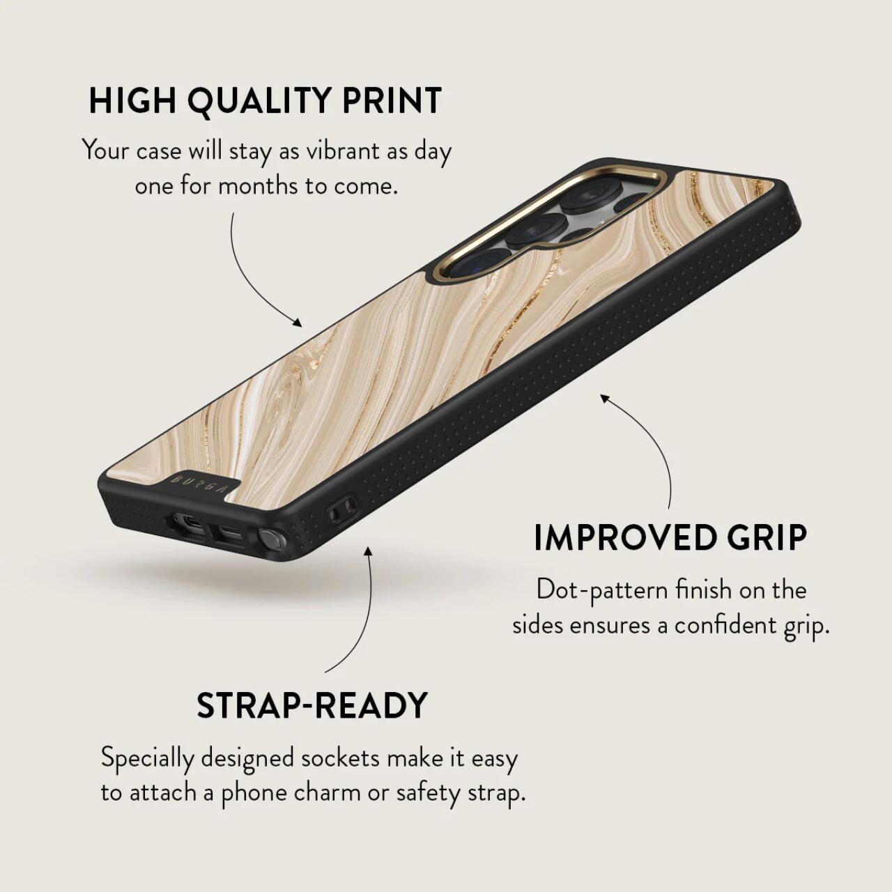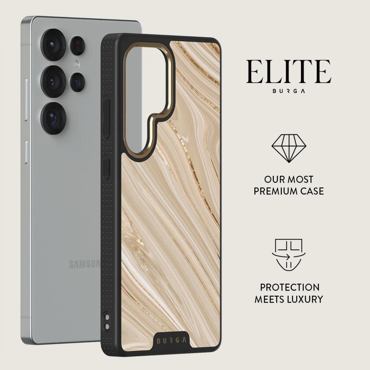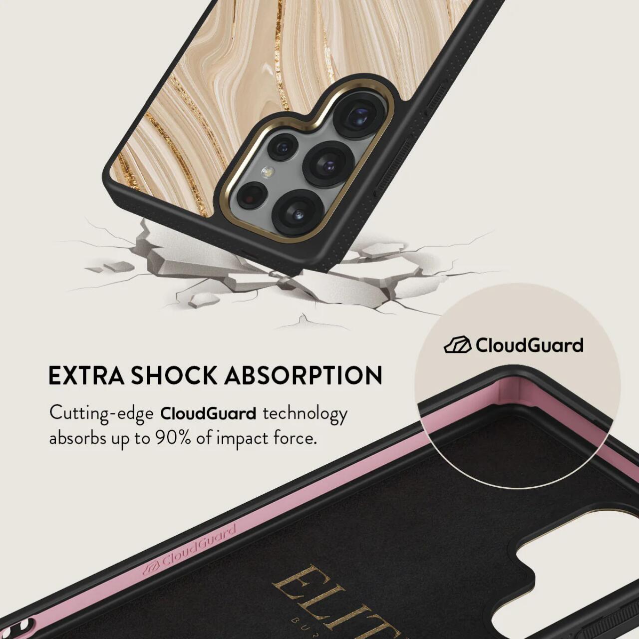 Elite Gold Full Glam hoesje voor Samsung Galaxy S25 Ultra van Burga, is voorzien van CloudGuard technologie die bescherming biedt tegen schade en is ontworpen voor schokabsorptie en verdediging. Terwijl de harde buitenkant beschermt tegen krassen en vallen, dempt de TPU-siliconen binnenlaag de telefoon door tot 90% van de impact te absorberen.
