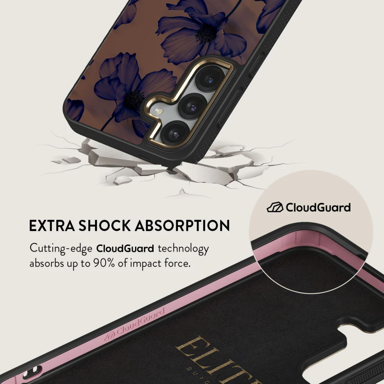 De Elite Gold Velvet Night Case voor Samsung Galaxy S25 van Burga is voorzien van CloudGuard-technologie die bescherming biedt tegen schade en is ontworpen voor schokabsorptie en verdediging. Terwijl de harde buitenkant beschermt tegen krassen en vallen, dempt de TPU-siliconen binnenlaag de telefoon door tot 90% van de impact te absorberen.