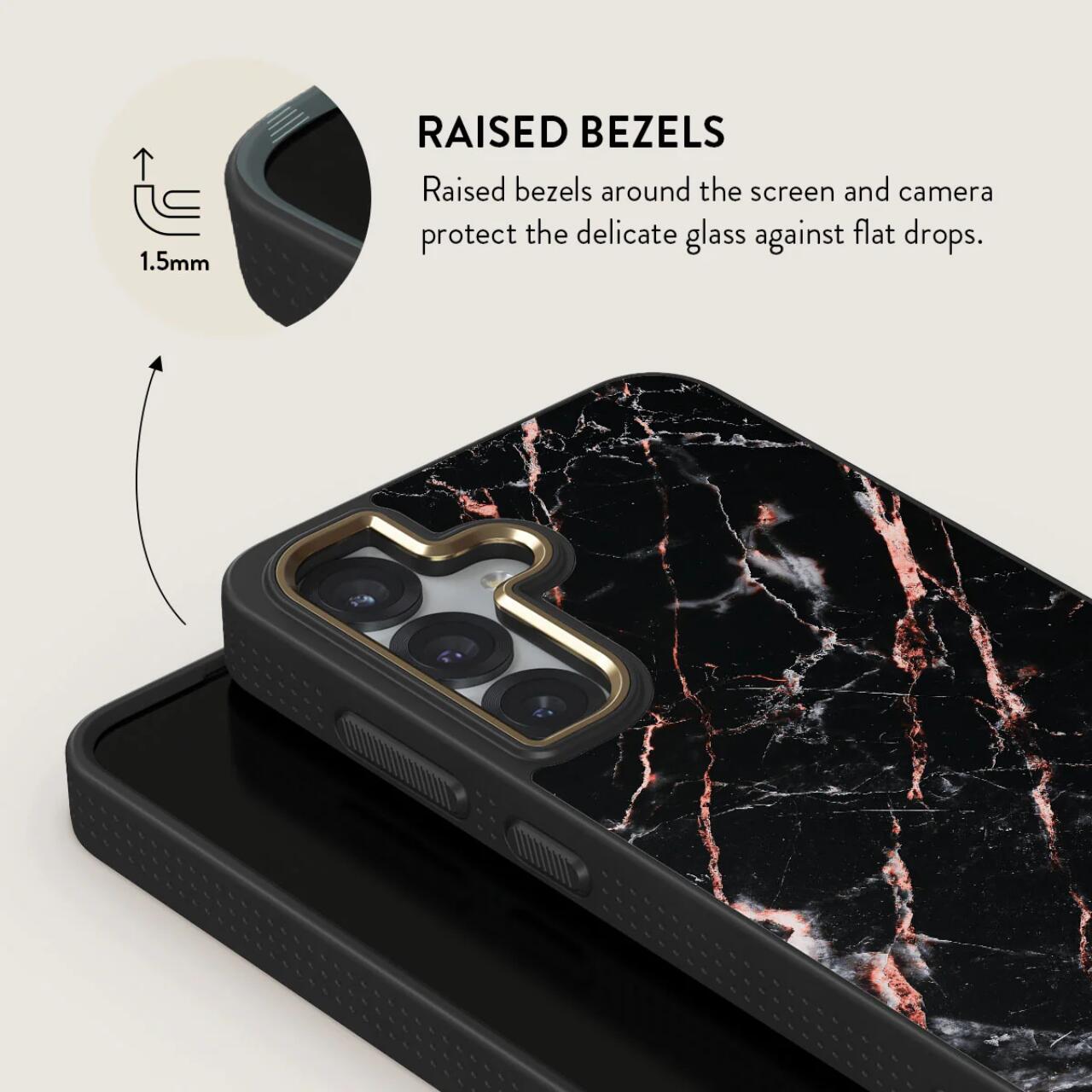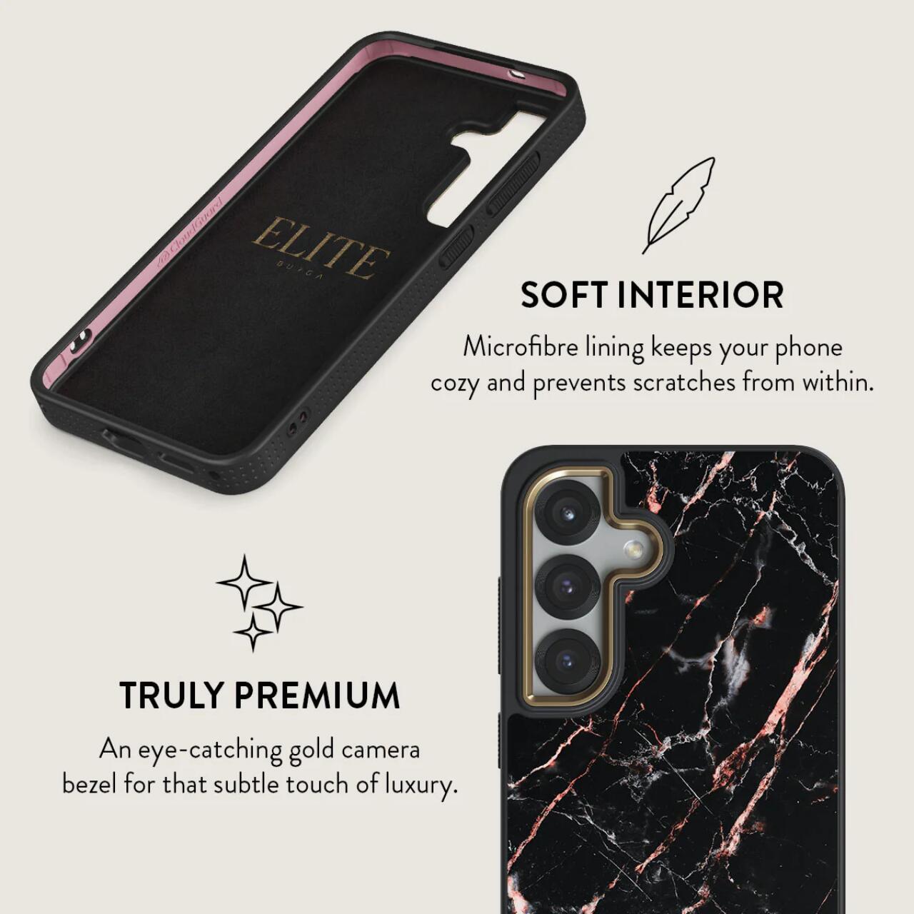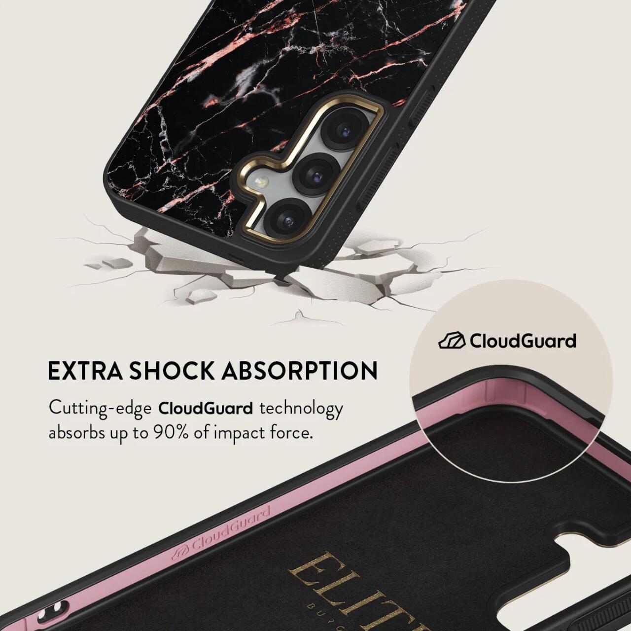 Elite Gold Rose Gold Marble hoesje voor Samsung Galaxy S25 Plus van Burga, is voorzien van CloudGuard-technologie die bescherming biedt tegen schade en is gebouwd voor schokabsorptie en verdediging. Terwijl de harde buitenkant beschermt tegen krassen en vallen, dempt de TPU-siliconen binnenlaag de telefoon door tot 90% van de impact te absorberen.