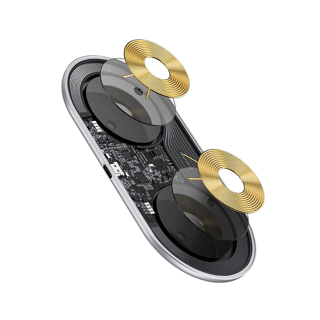 Eenvoudig 2 in 1 draadloze lader heeft kleine afmetingen en een elegant, slank ontwerp, slechts 8 mm dik. Hiermee kunnen twee Qi -compatibele apparaten (draadloos opladen) tegelijkertijd worden geladen. Je hoeft alleen de apparaten op de standaard te plaatsen en de lading begint. Het maximale maximale vermogen is 15W bij het laden van twee apparaten of 10W max aan één zijde tegelijkertijd. De oplader past zich automatisch aan, afhankelijk van het vermogen om het vermogen te laden. Bijvoorbeeld voor twee 10W + 5W Android -telefoons, voor twee iPhone 7,5W + 7,5 W of een iPhone en AirPods 7,5W + 2,5 W.