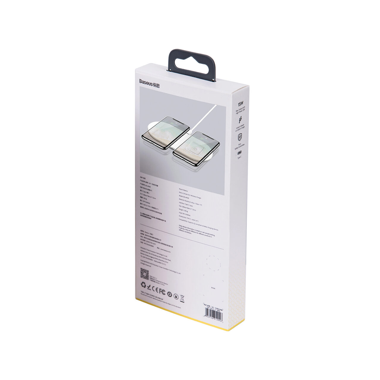 Baseus Simple 2 in 1 Draadloze Oplader 15W Wit (voor telefoons en AirPods) De Simple 2 in 1 Draadloze oplader van Baseus heeft kleine afmetingen en een elegant, slank ontwerp, slechts 8 mm dik.