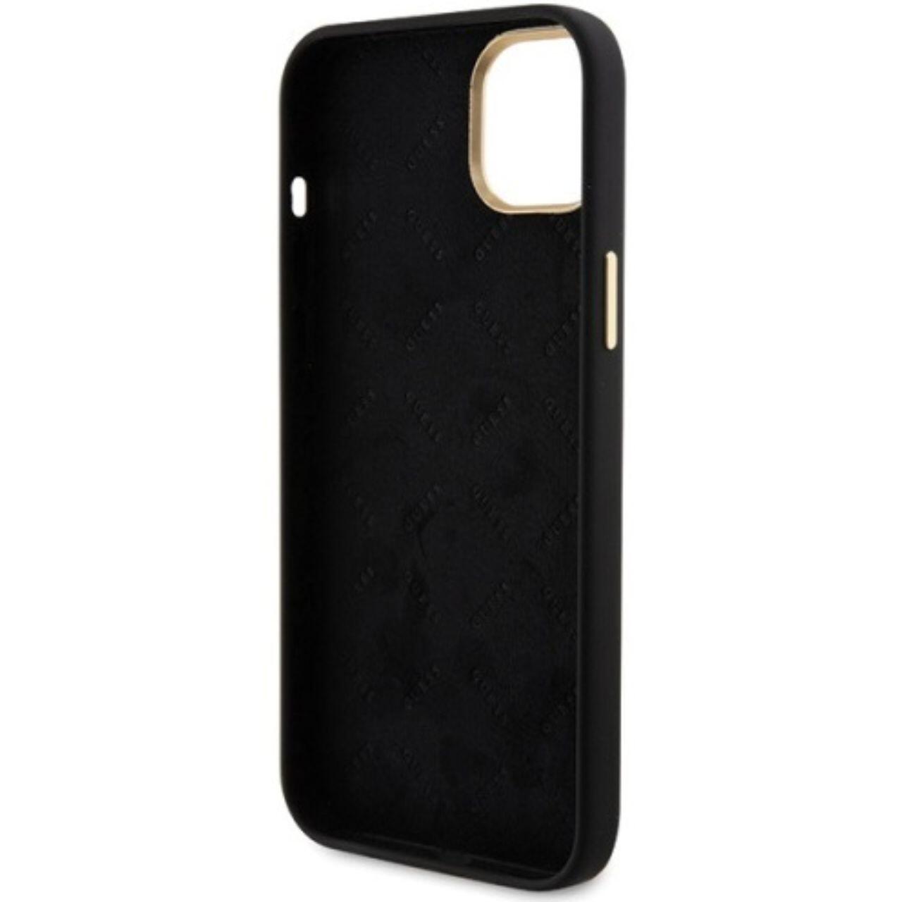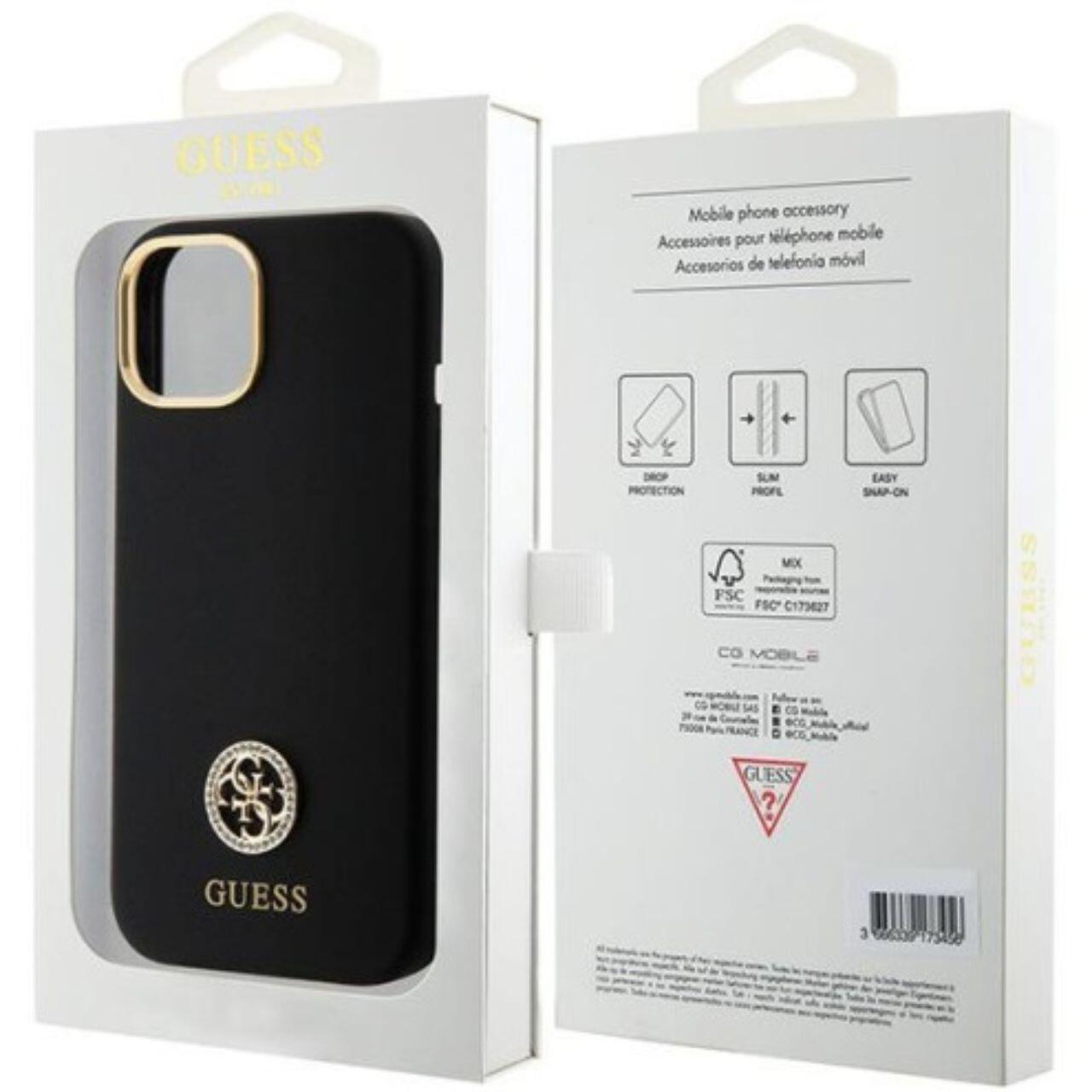 Guess Vloeibaar siliconen hoesje 4G Strass Metal Logo iPhone 15 Zwart