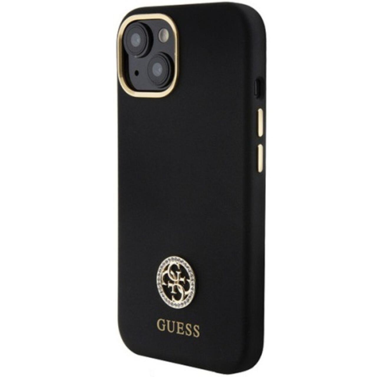 Guess Hoesje Vloeibaar Siliconen 4G Strass Metaal Logo iPhone 15 Zwart