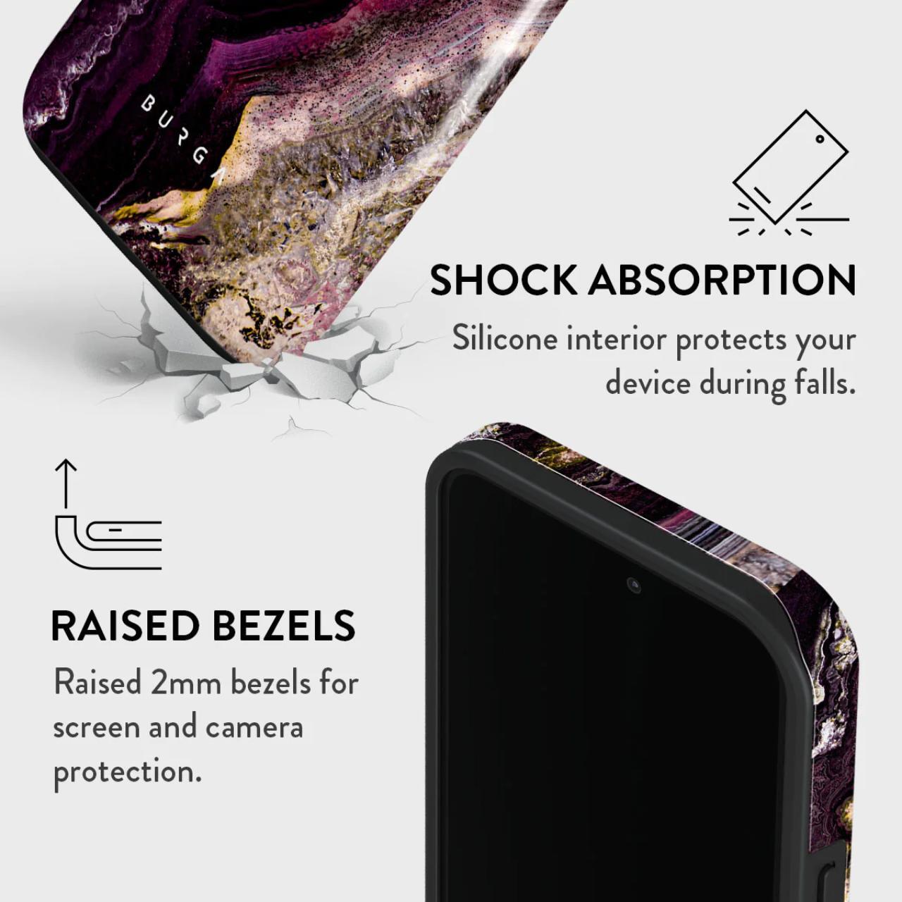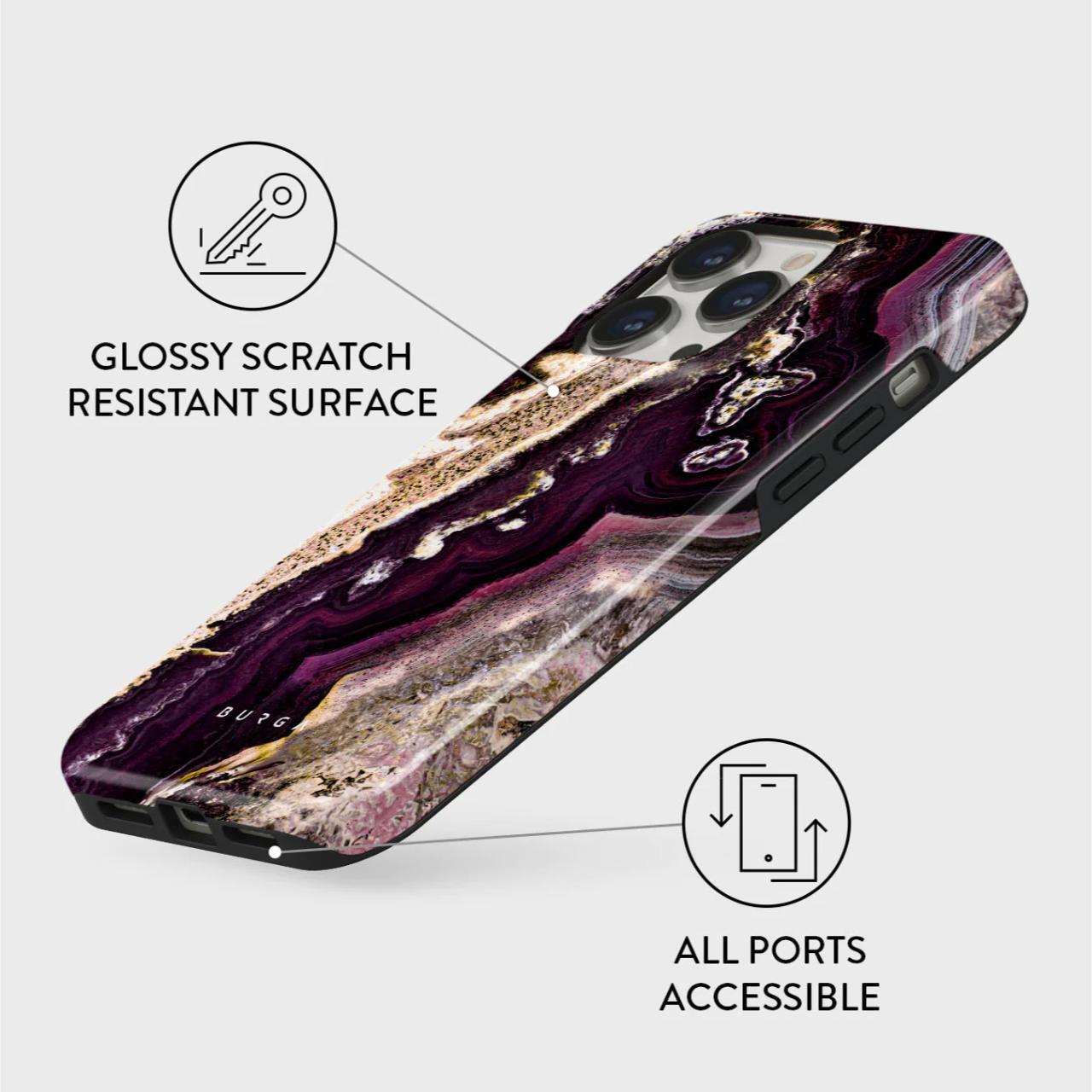 Het Dual Layer Purple Skies iPhone 14 Pro hoesje van Burga is uniek ontworpen met een dubbellaagse hybride structuur. Siliconen TPU-binnenlaag en een stevige pc-buitenlaag van militaire kwaliteit bieden schokabsorptie, duurzaamheid en robuuste bescherming tegen krassen, terwijl verhoogde randen van 2 mm scherm- en camerabescherming bieden.