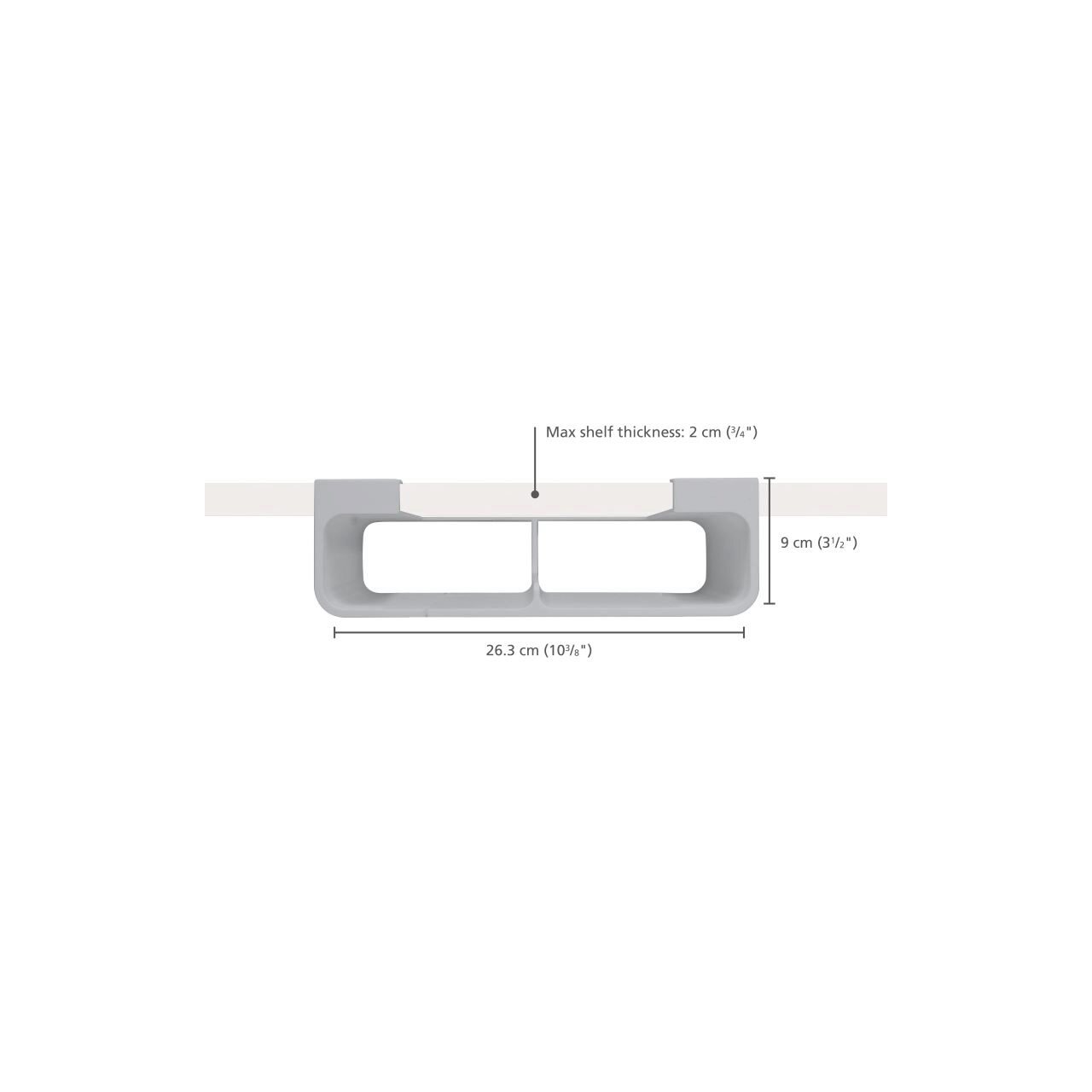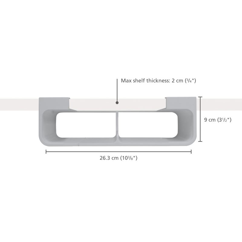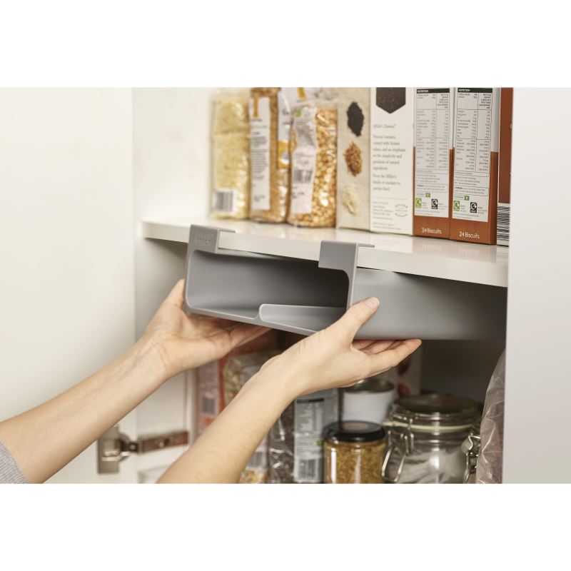 Dit innovatieve ontwerp gebruikt de ongebruikte ruimte onder de tweedelige open kastplank om rollen of dozen vershoudfolie, bakpapier, bakpapier of mandvoeringen op te bergen. Geschikt voor keukenblokken van meer dan 26 cm breed.