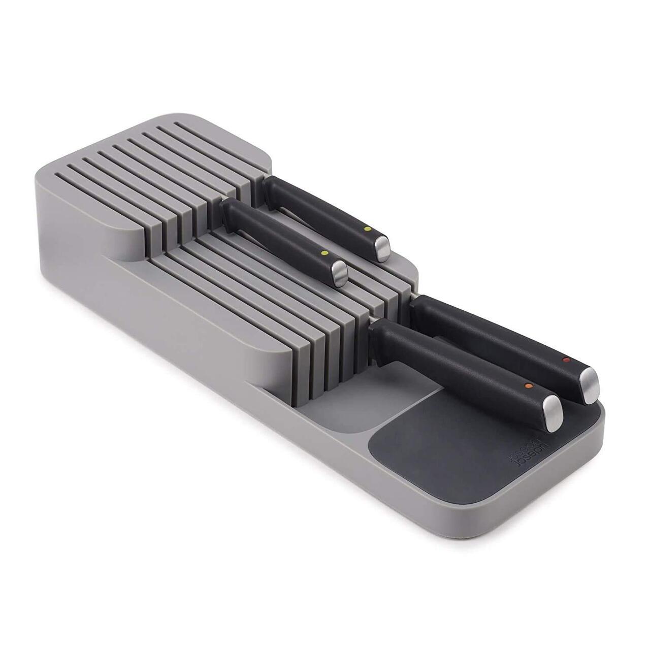 Bewaar scherpe messen veilig in je besteklade met deze compacte organizer. Het heeft 2 niveaus voor gemakkelijke toegang en biedt plaats aan maximaal negen messen met verschillende meslengtes. Hechtende voetjes stoppen de beweging van het apparaat in de lade. Met de hand wassen en drogen. Geschikt voor mesjes tot 9inch (23cm). Geschikt voor lades met een minimale hoogte van 7,5 cm (3 inch)