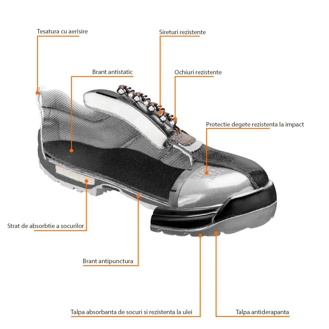 - Schoenbeschermingsklasse: S1P ( slagvaste bom, antislipzool, gesloten hielgedeelte, energieabsorptie in het hielgedeelte, antistatische eigenschappen, penetratiebestendige zool)