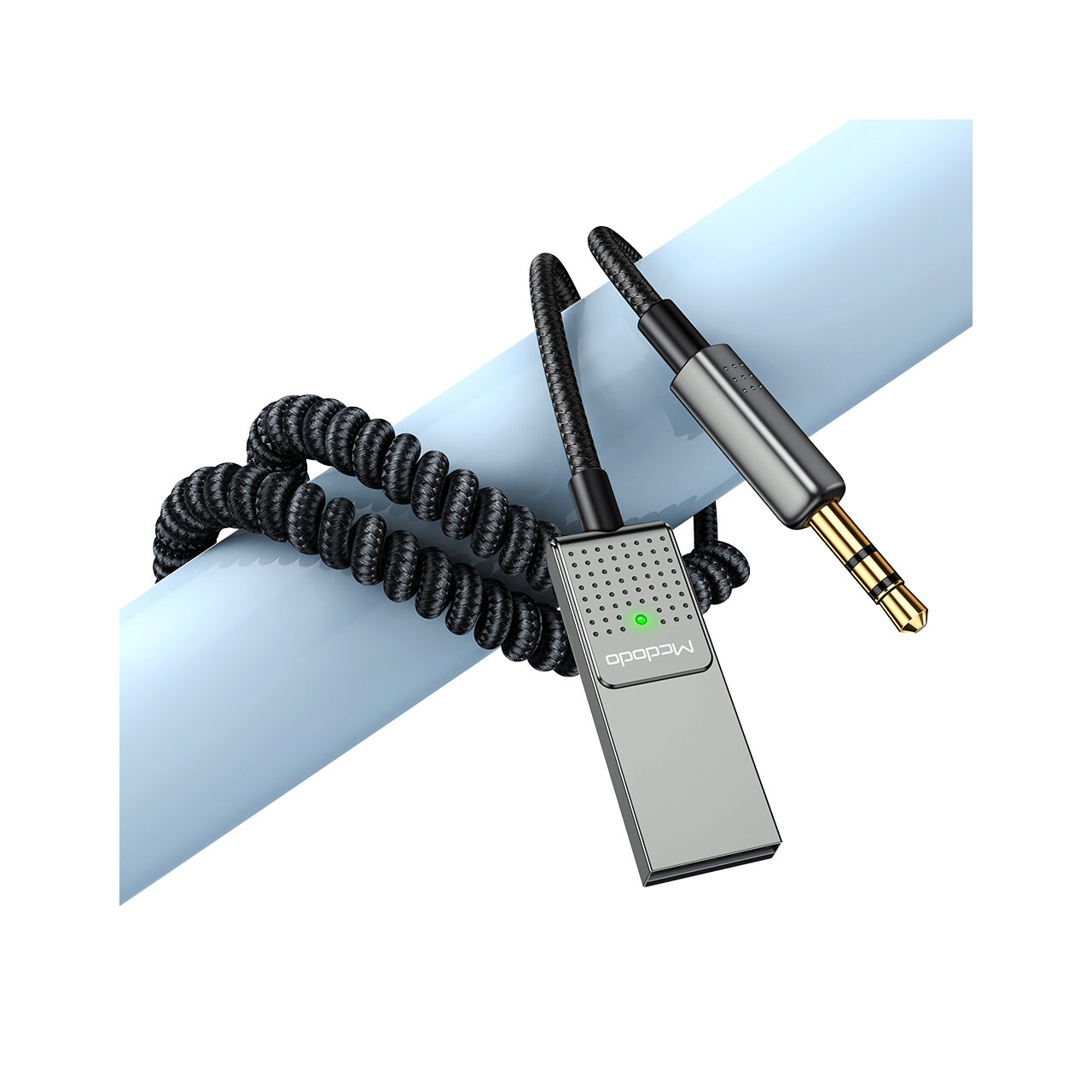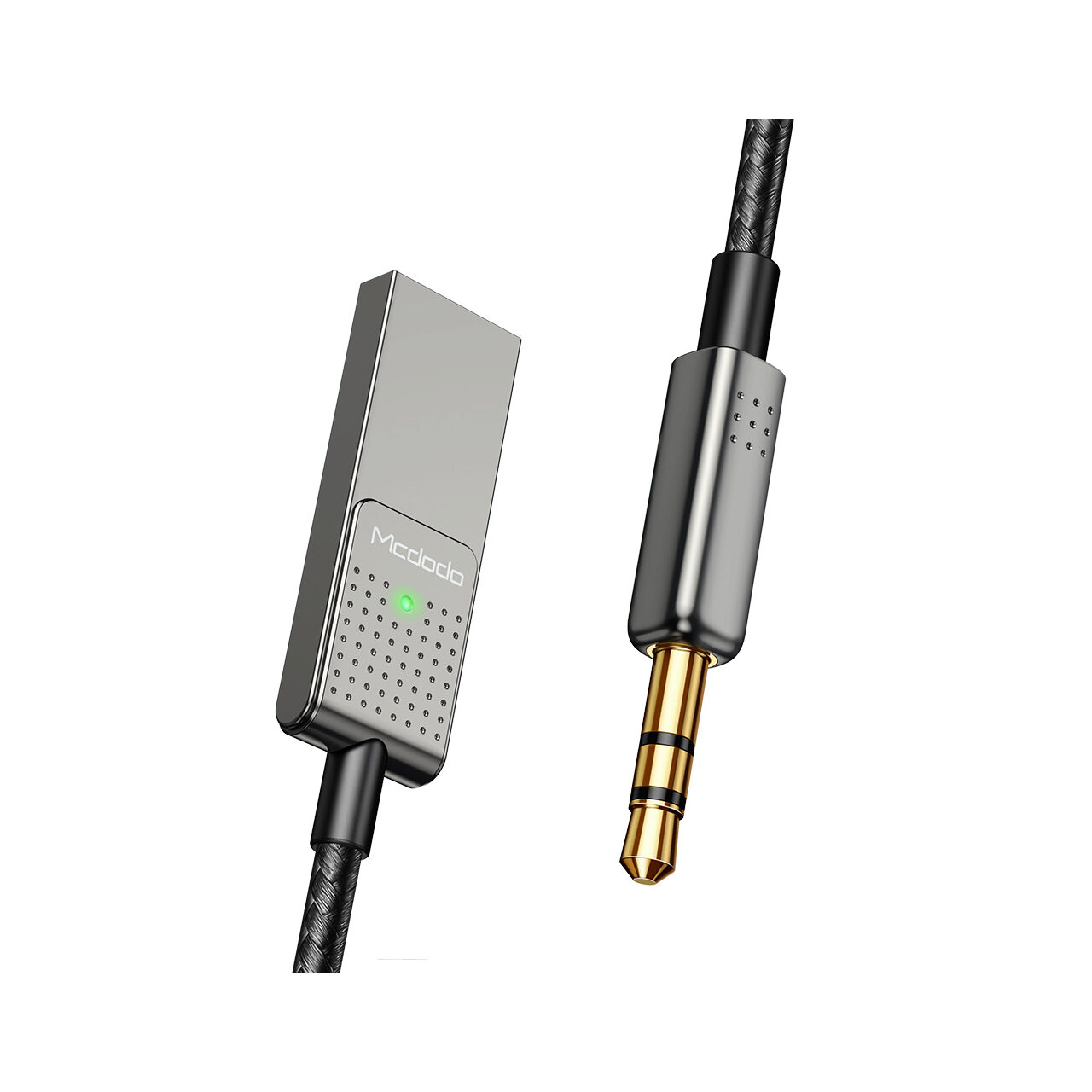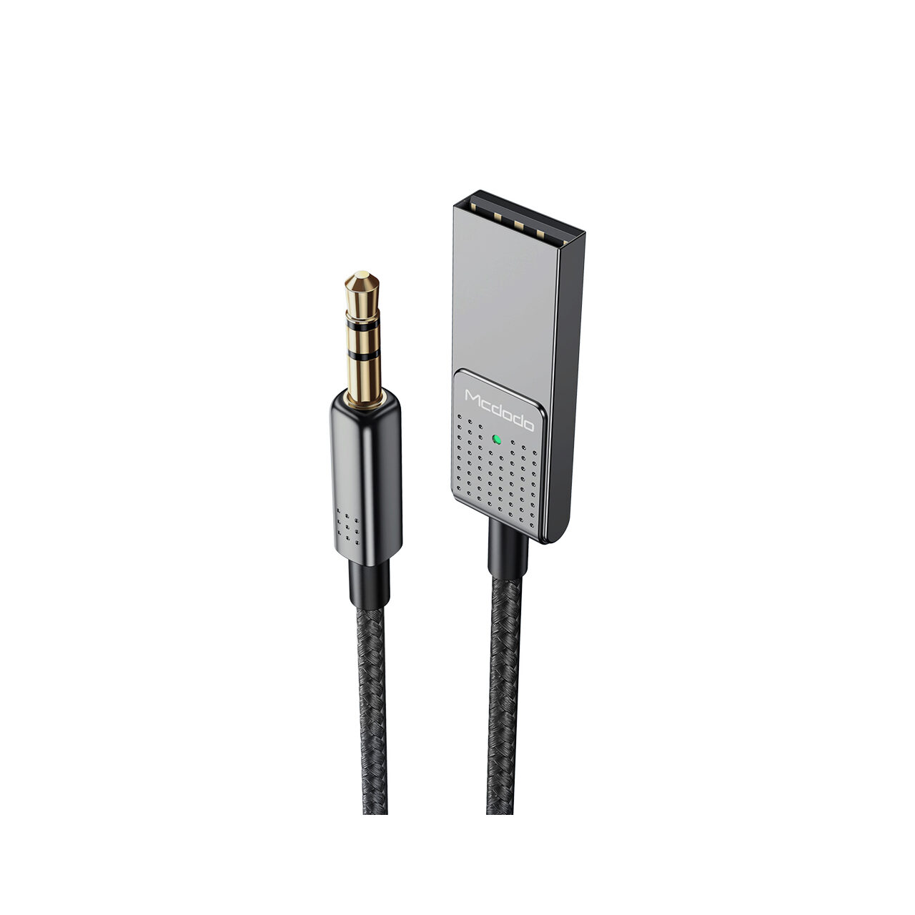 Mcdodo USB-audiokabel naar 3,5 mm jack-poort Zwart met bluetooth, kan worden gebruikt zowel voor het opladen als voor het synchroniseren van gegevens samen met apparaten met een 3,5 mm Jack-connector. Hij is bedekt met textielgaas voor meer weerstand en om verwarring te voorkomen.