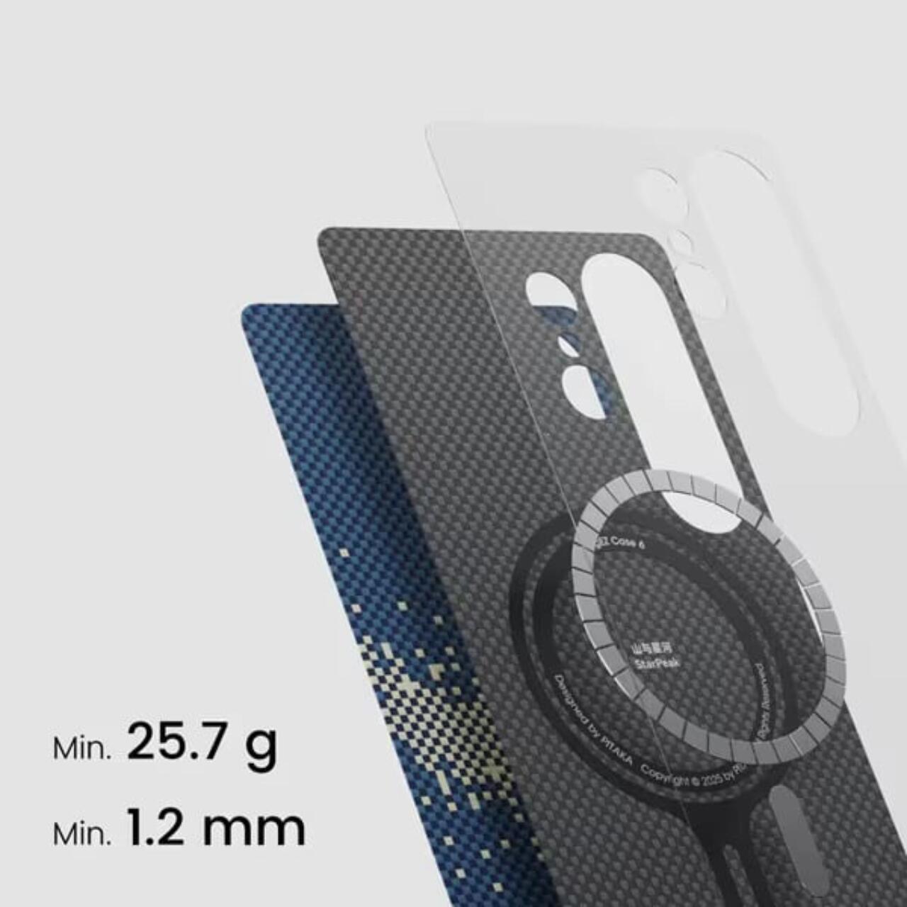 Het MagEZ 5 Starpeak Aramid MagSafe Samsung Galaxy S25 Ultra hoesje van Pitaka is dun en licht dankzij de Amber Magnet Film-technologie. Hierdoor is de magnetische ring perfect geïntegreerd in het hoesje, blijft de stevigheid behouden en is het ontwerp dunner en lichter.
