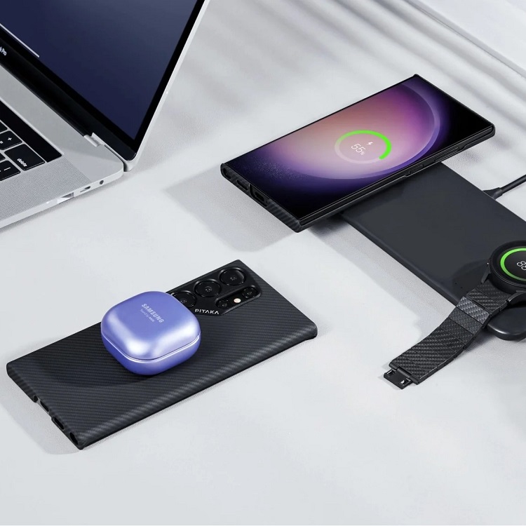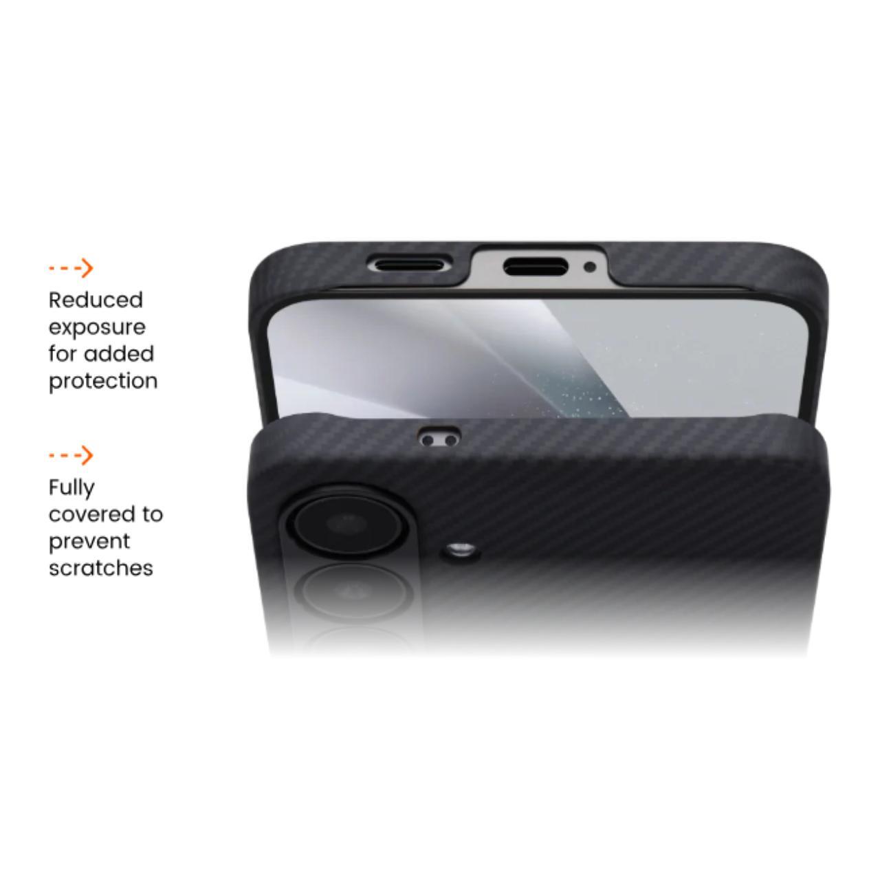 De koolstofvezel is geweven met de Pitaka Fusion Weaving™-techniek, voor een unieke stijl en elegante kleurencombinaties. De knoppen van de telefoon zijn volledig toegankelijk en voelen natuurlijk aan tijdens het gebruik. De cameramodule wordt beschermd door een aluminium frame en recyclebare aramidevezels, wat veiligheid en duurzaamheid biedt. Het scherm blijft perfect zichtbaar vanuit elke hoek, zonder beperkingen.