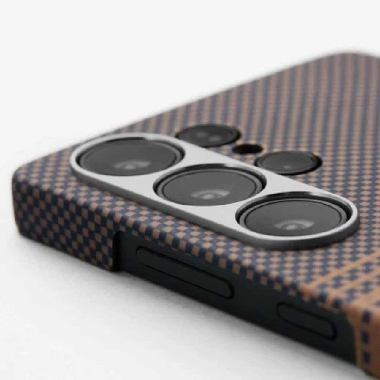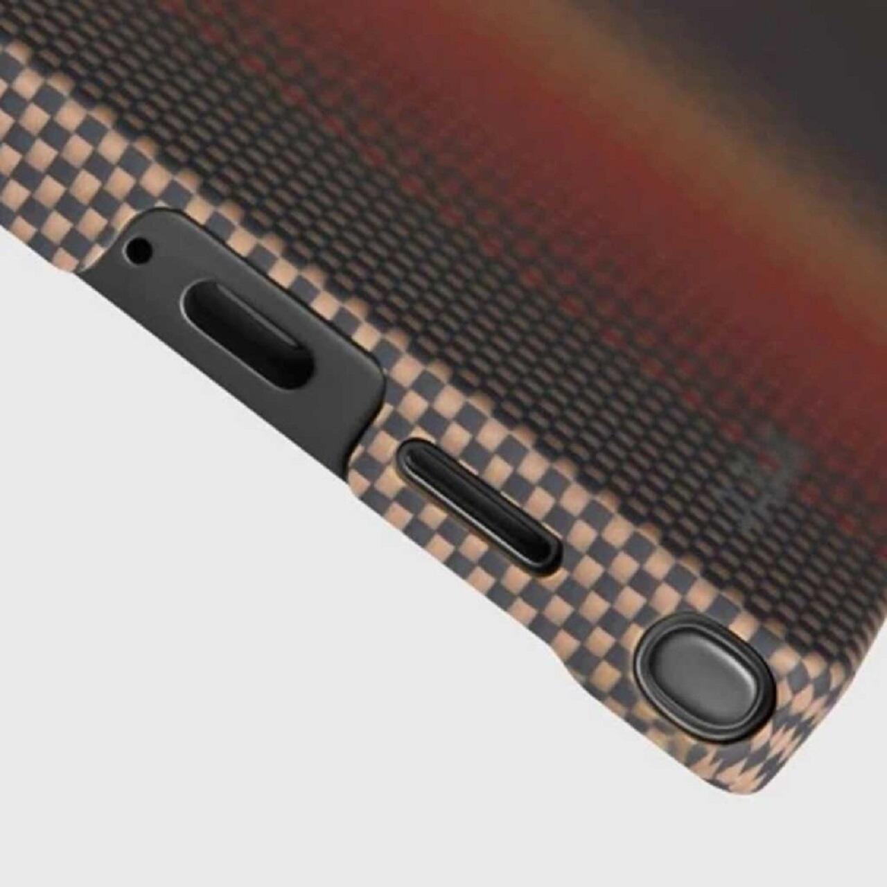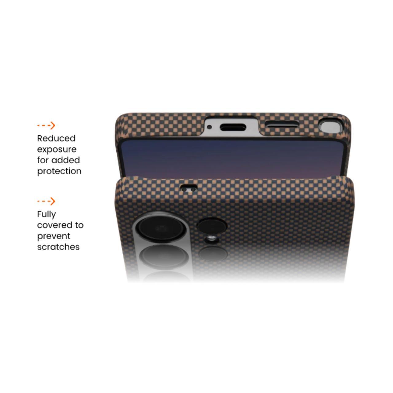 De koolstofvezel is geweven met de Pitaka Fusion Weaving™-techniek, voor een unieke stijl en elegante kleurencombinaties. De knoppen van de telefoon zijn volledig toegankelijk, waardoor ze natuurlijk aanvoelen tijdens het gebruik. De cameramodule wordt beschermd door een aluminium frame en recyclebare aramidevezel, wat veiligheid en duurzaamheid biedt. Het scherm blijft perfect zichtbaar vanuit elke hoek, zonder beperkingen.