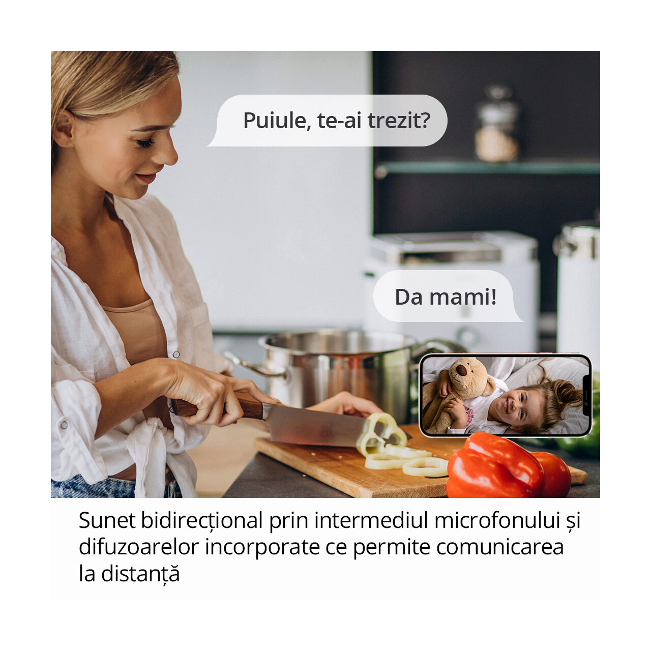 Bidirectioneel geluid: De ingebouwde microfoon en luidsprekers maken communicatie op afstand met uw dierbaren mogelijk via deze EASYCARE® BABY smart videocamera.