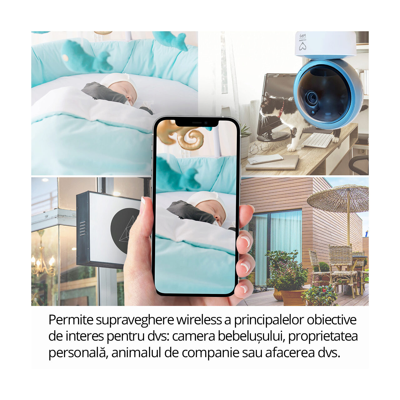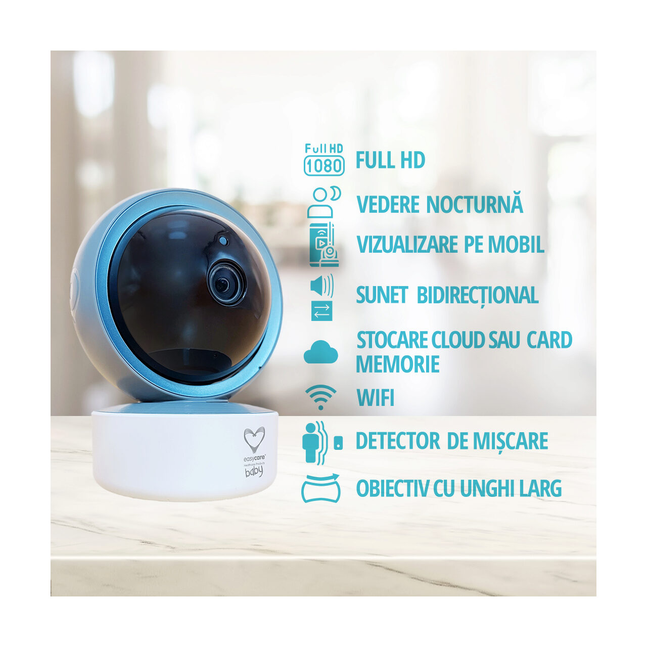 WiFi Smart Video Camera voor EASYCARE BABY-bewaking Met de WiFi Smart Video Camera voor EASYCARE® BABY-bewaking kunt u uw huis of een camera in uw huis bewaken met 1080P IP Full HD-helderheid vanaf uw pc, smartphone of tablet. Er wordt een gratis, gebruiksvriendelijke applicatie gebruikt. Deze is ideaal voor het bewaken van de kinderkamer, huisdieren of andere objecten die u interesseren, op elk moment en op elke dag. De applicatie is compatibel met IOS, Android of Windows.