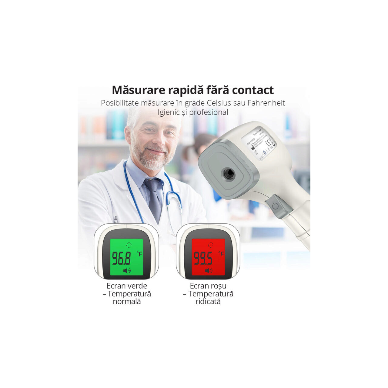 - Fever alert with acoustic and visual alarm, with configurable alert threshold