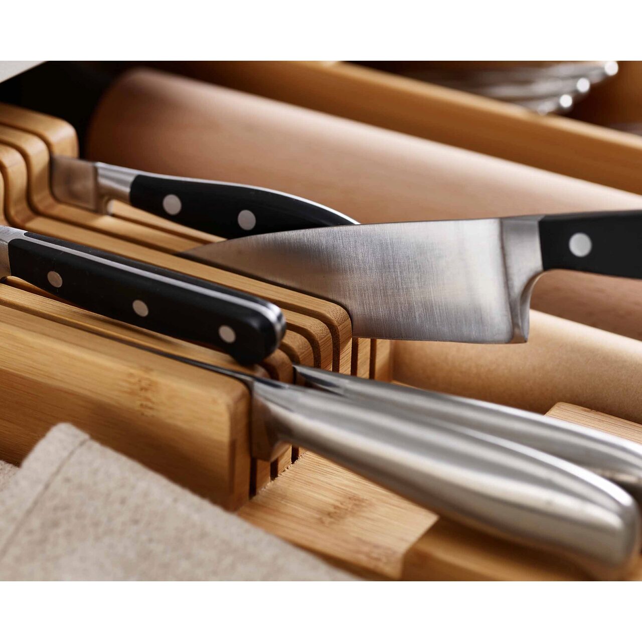 Keep your knives sharp safely in your cutlery drawer with this compact knife organizer, it has 2 levels for easy access and can hold up to nine knives with different blade lengths.