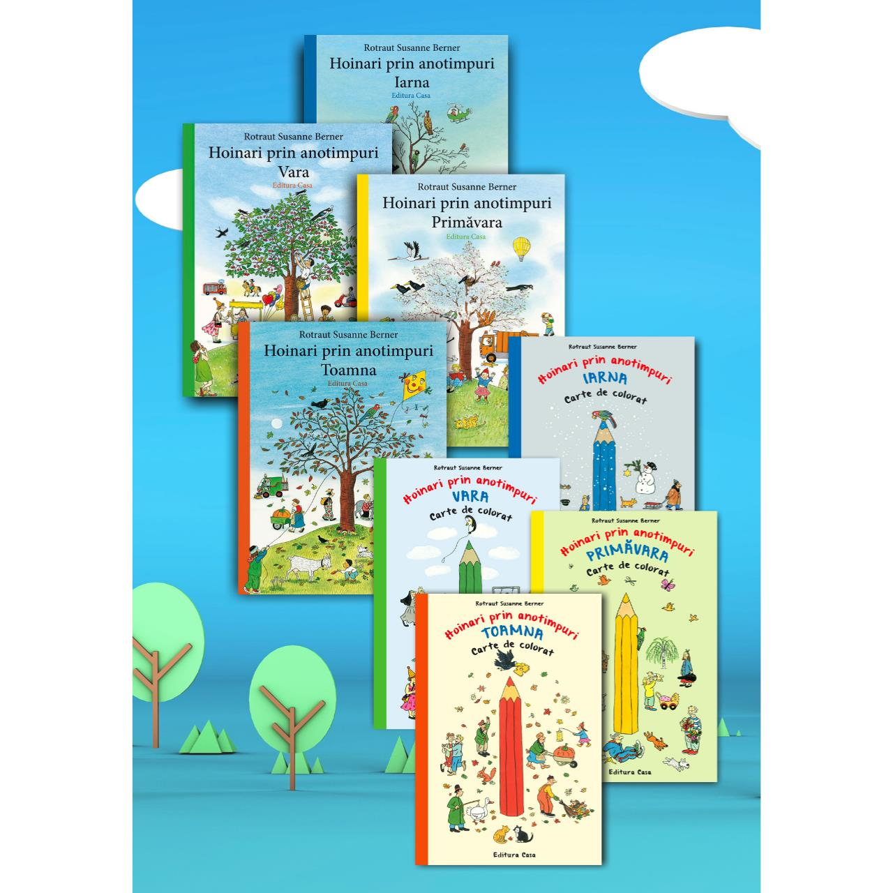 Pachetul conține cele 4 volume ale colecției Hoinari prin anotimpuri (Primăvara, Vara, Toaman, Iarna), precum și cele 4 cărți de colorat Hoinari prin anotimpuri (Primăvara, Vara, Toaman, Iarna).