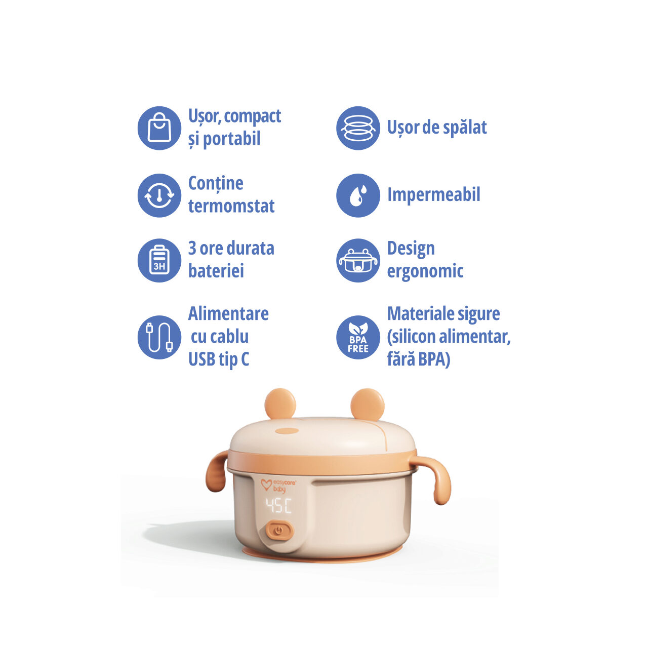 The Easycare Baby portable electric heater is ideal for heating food for babies or children. It contains a rechargeable battery that allows a duration of operation of up to 3 hours. It is portable, being useful for trips and short walks. It charges quickly with the USB adapter, type C. After the heating process at 45C, it maintains the constant temperature of the food, through the built-in thermostat. The Easycare Baby Portable Electric Warmer is made from safe, BPA-free materials and is easy to disassemble, clean and sterilize. It is easy to use, by pressing a single button. The box contains: Easycare Baby portable heater, power cable, user manual with warranty certificate.