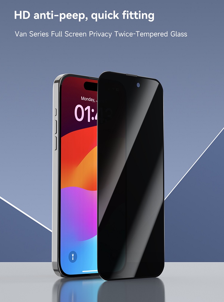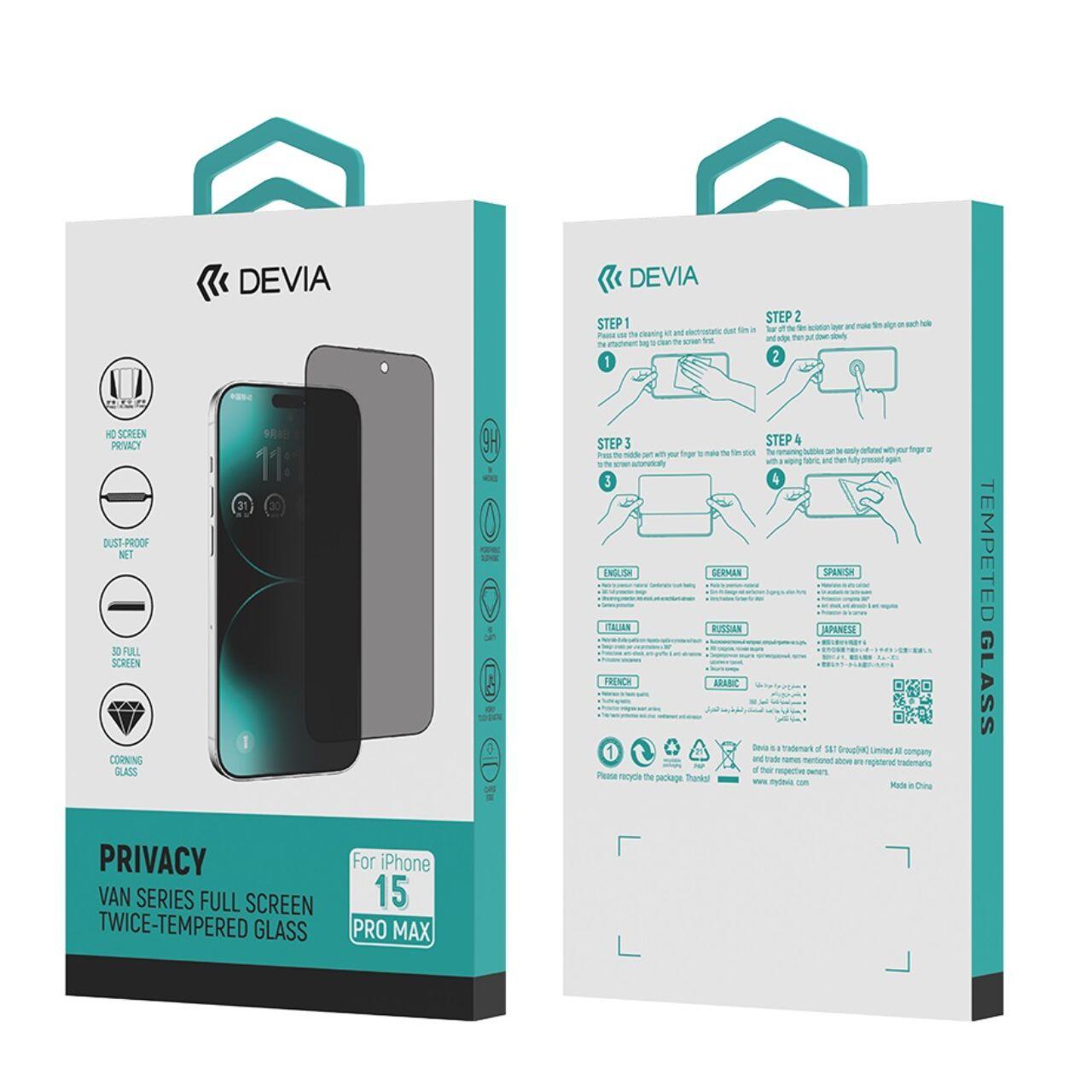 Folia de Sticla Van Series Full Screen Privacy Twice, de la Devia pentru iPhone 15 Pro Max este o folie premium din sticla De doua ori temperata (securizata), foarte rezistenta la zgarieturi si socuri si rezista la temperaturi mari si are un strat de protectie oleofobic care protejeaza impotriva petelor.Laturi duble 180° anti-peep, partea din fata este mai clara,partea laterala este mai rezistenta.