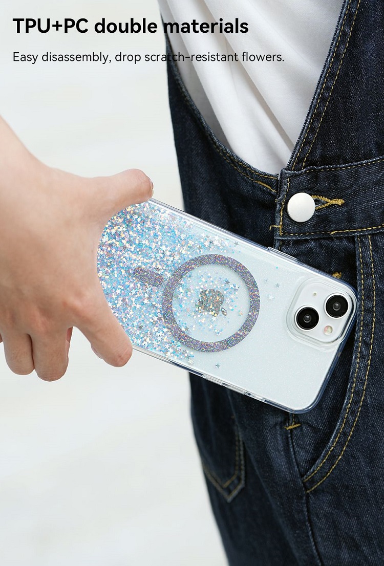 Pe partea din spate este umpluta cu lichid si sclipici ce ofera un aspect stralucitor si captivant, iar in rest este transparenta lasand la vedere sclipiciul ce se plimba prin husa de fiecare data cand este miscata.