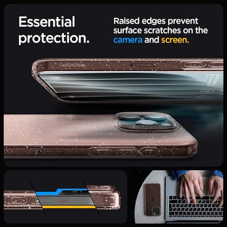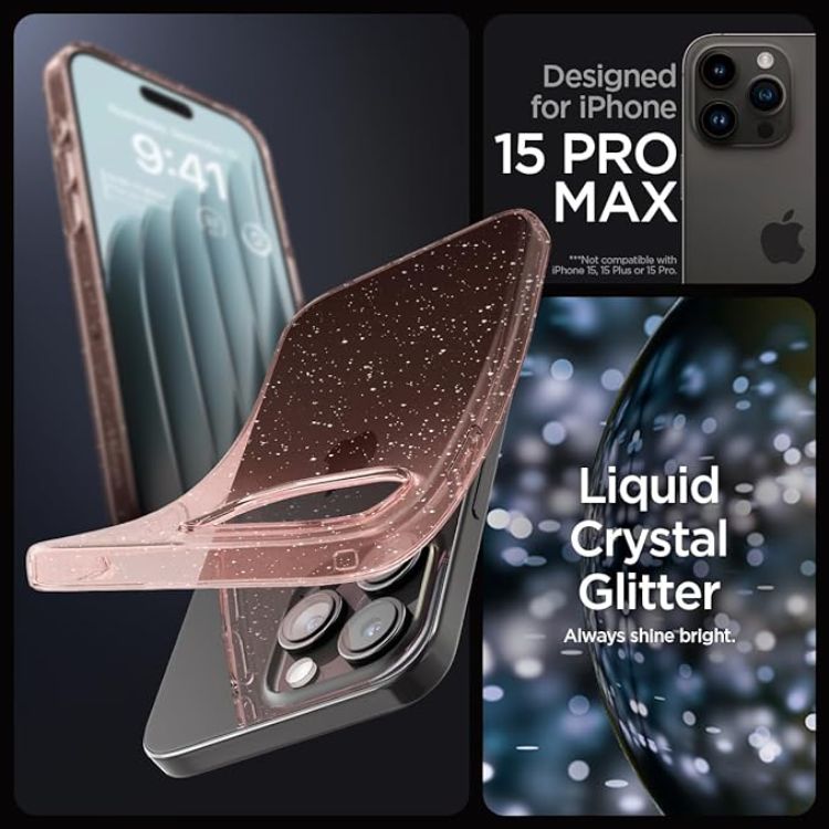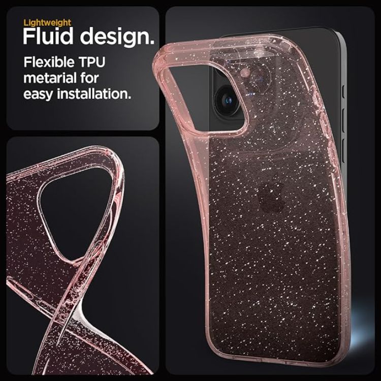 Husa Liquid Crystal Glitter iPhone 15 Pro Max Rose Quartz este realizata din silicon flexibil transparent ce preia eventualele vibratii ale unui soc si protejeaza impotriva zgarieturilor.