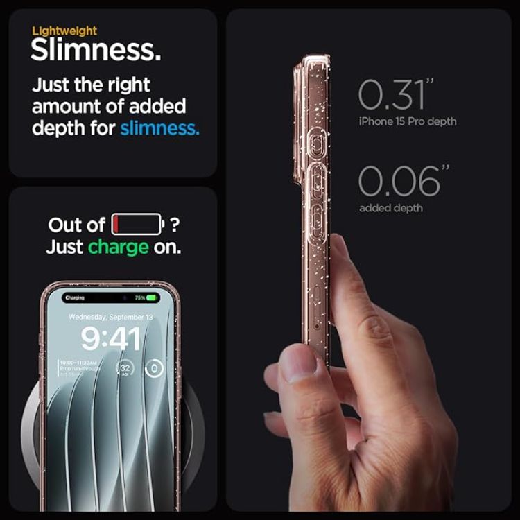 Nu adauga volum telefonului si ii ofera un plus de stralucire in lumina datorita glitter-ului incorprat in material. In jurul camerei este usor inaltata pentru a o proteja atunci cand asezati telefonul pe o suprafata plana.