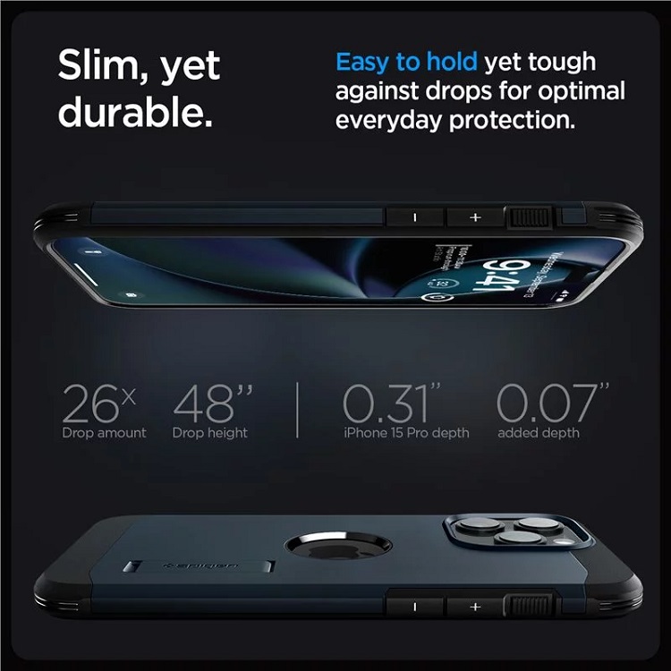 Husa Tough Armor de la Spigen pentru iPhone 15 Pro Max absoarbe socurile unei eventuale cazaturi cu succes datorita combinatiei de materiale de calitate folosite: invelis dur (Policarbonat) pe exterior, silicon moale pe margini si o extra protectie din spuma la interior. In plus colturile folosesc tehnologia Air Cushion ce diminueaza vibratiile socului. Este certificata military grade MIL-STD 810G-516.6 impotriva cazaturilor.