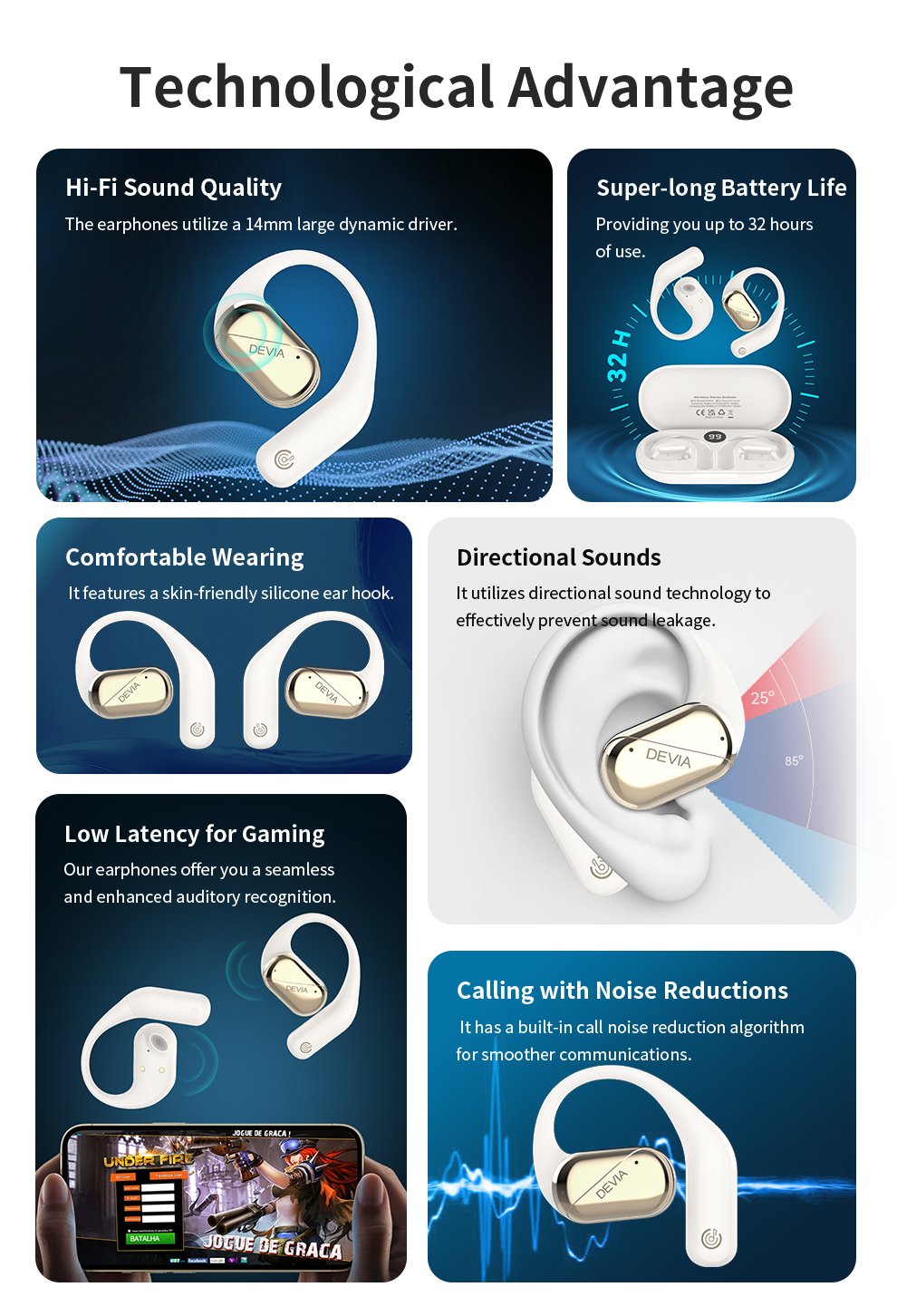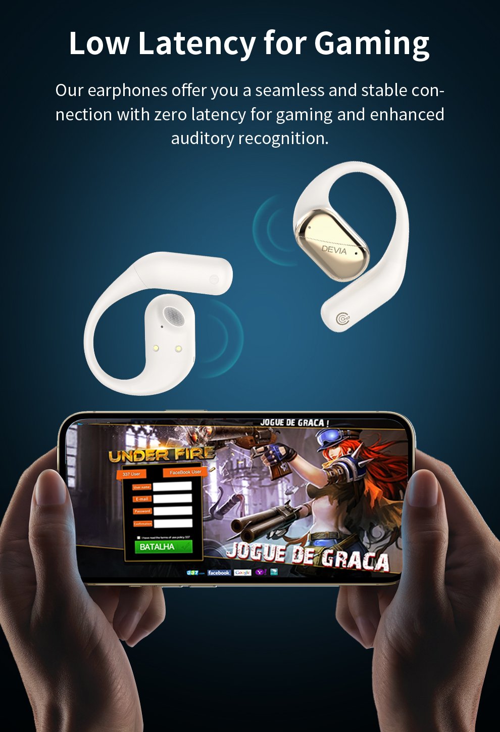 Pentru pasionatii de jocuri, castile Devia OWS Lite1 includ un Game Mode care reduce latenta audio, oferindu-va o experienta de joc fara intreruperi. Aceasta inseamna ca sunetele din joc vor fi sincronizate perfect cu actiunea de pe ecran.