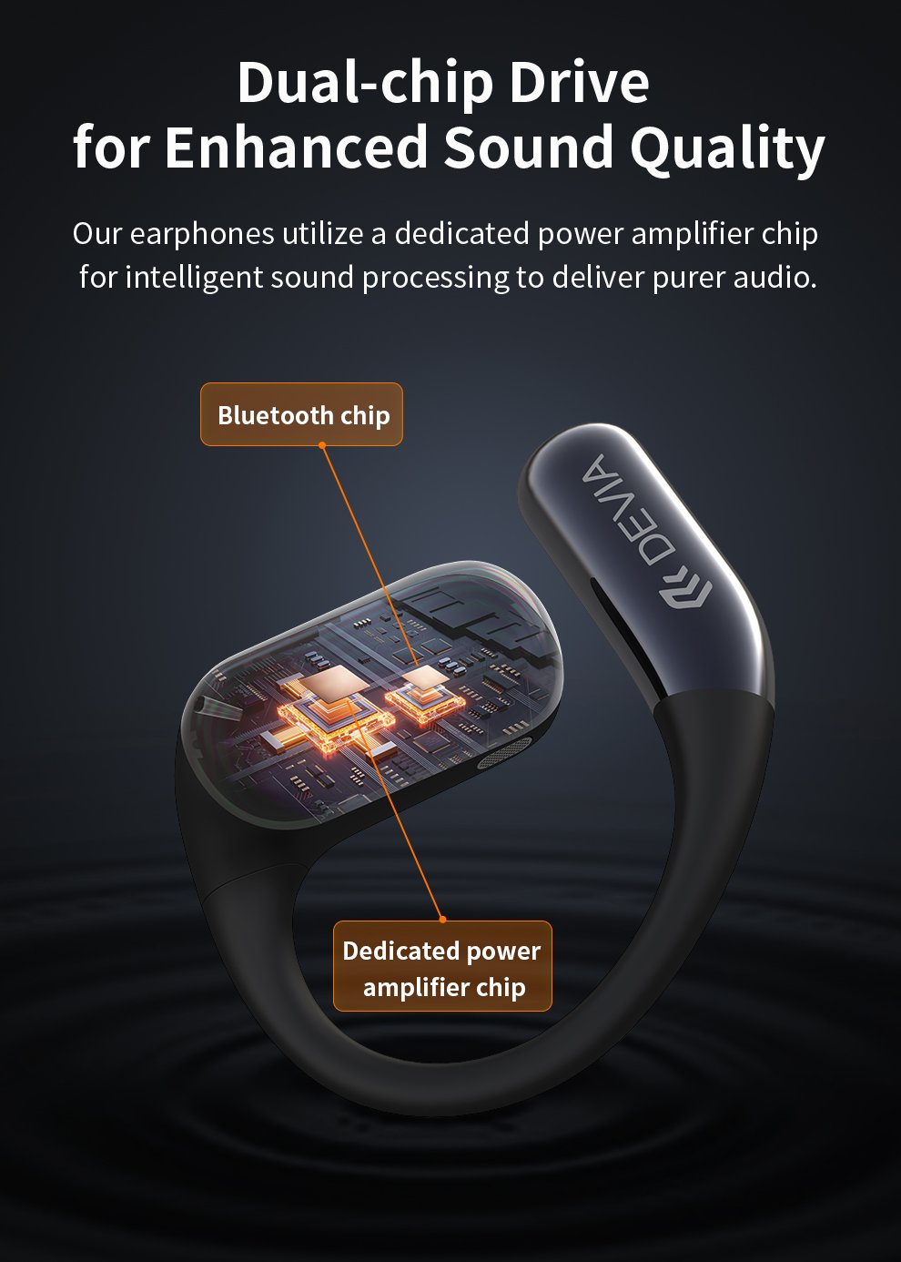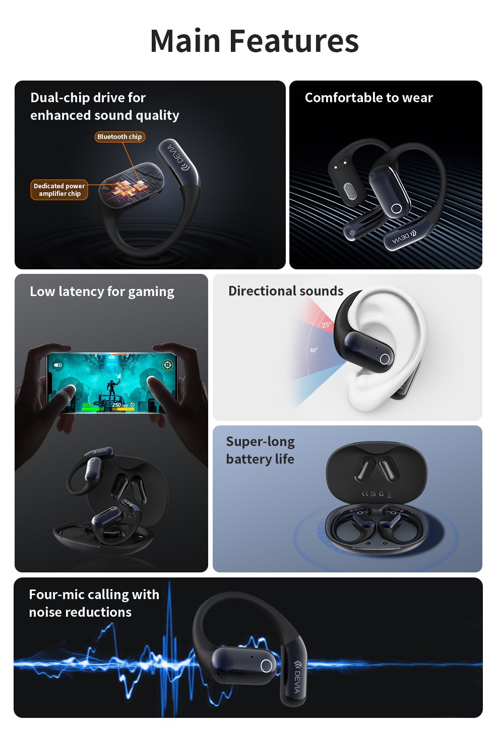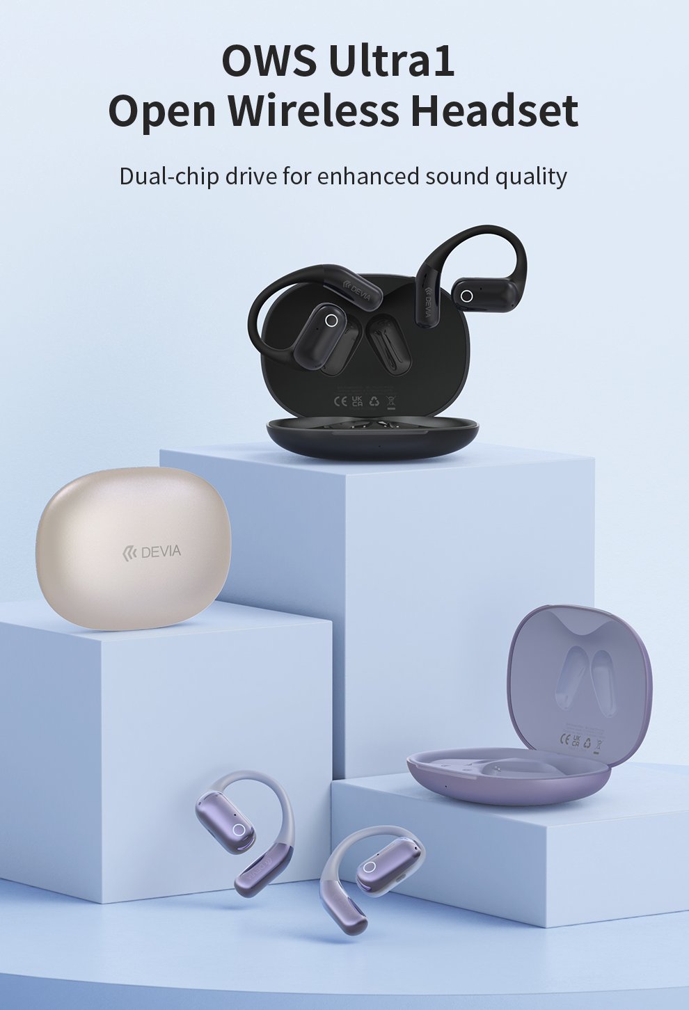 Castile wireless Open-Ear OWS Ultra1 de la Devia sunt alegerea potrivita pentru utilizatorii care doresc un echilibru intre performanta, confort si design modern. Acestea se remarca printr-un design ergonomic si elegant, fiind concepute pentru a oferi un sunet clar si o experienta de ascultare confortabila, fara a fi limitati de cabluri.