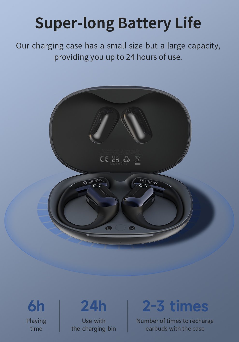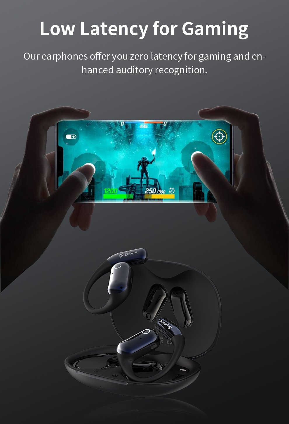 Game Mode pentru Experienta de Joc Imersiva Pentru pasionatii de jocuri, castile Devia OWS Ultra1includ un Game Mode care reduce latenta audio, oferindu-va o experienta de joc fara intreruperi. Aceasta inseamna ca sunetele din joc vor fi sincronizate perfect cu actiunea de pe ecran.