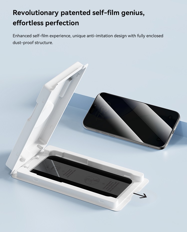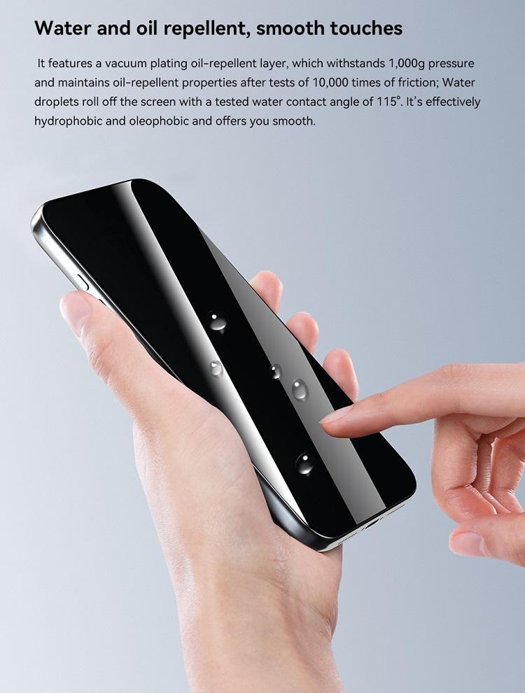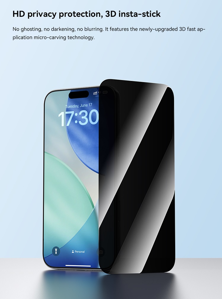 Folia de Sticla Van Series Full Screen Privacy, cu kit special de montare de la Devia pentru iPhone 17 Pro este o folie premium din sticla temperata (securizata), foarte rezistenta la zgarieturi si socuri si rezista la temperaturi mari si are un strat de protectie oleofobic care protejeaza impotriva petelor.