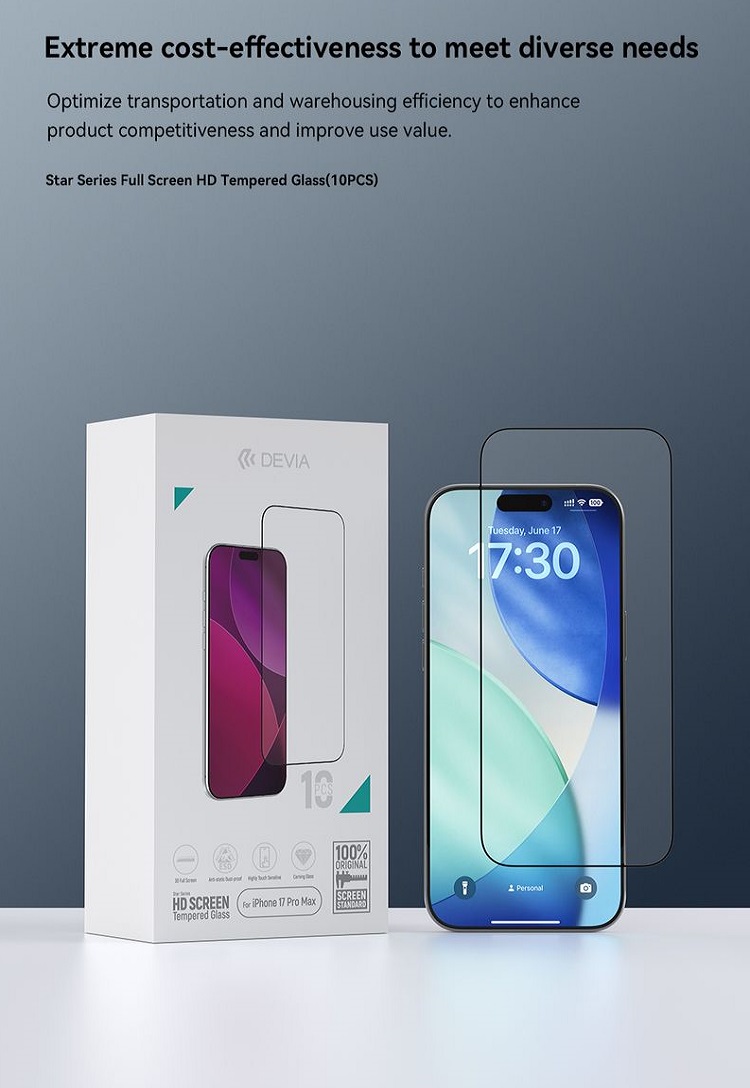 Folie Sticla Star Series Full Screen HD iPhone 17, pachet de 10 buc de la Devia, este o folie din sticla temperata (securizata), rezistenta la zgarieturi si socuri.