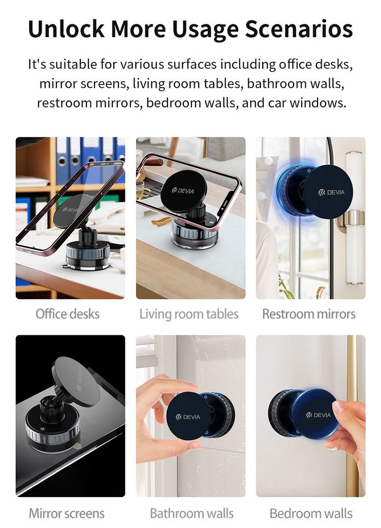 Indiferent daca stati la birou, in masina sau pozitionat pe o masa de sticla, suportul Devia se adapteaza nevoilor dumneavoastra. Reglajele de rotire si inclinare va permit sa gasiti unghiul de vizualizare perfect, in timp ce baza antiderapanta mentine suportul ferm in pozitie pe suprafete netede, texturate sau inclinate.