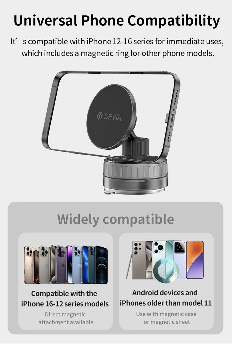 Este compatibil cu telefoane din seria iPhone 12-16 pentru utilizari imediate, iar cu inelul magnetic inclus cu alte modele de telefoane.