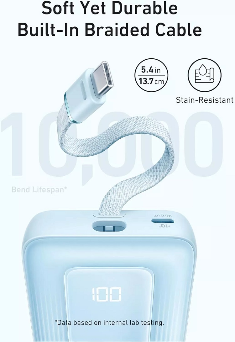 Acumulatorul extern Zolo 10.000 de la Anker, este partenerul ideal pentru cei care au nevoie de o sursa de alimentare portabila si fiabila. Cu o capacitate de 10.000 mAh, tehnologie de incarcare rapida si un design compact, acest powerbank este potrivit pentru a-ti mentine dispozitivele incarcate, indiferent unde te afli. Cablul USB-C integrat este creat pentru a rezista utilizarii intense, fiind testat sa reziste la peste 10.000 de indoiri.