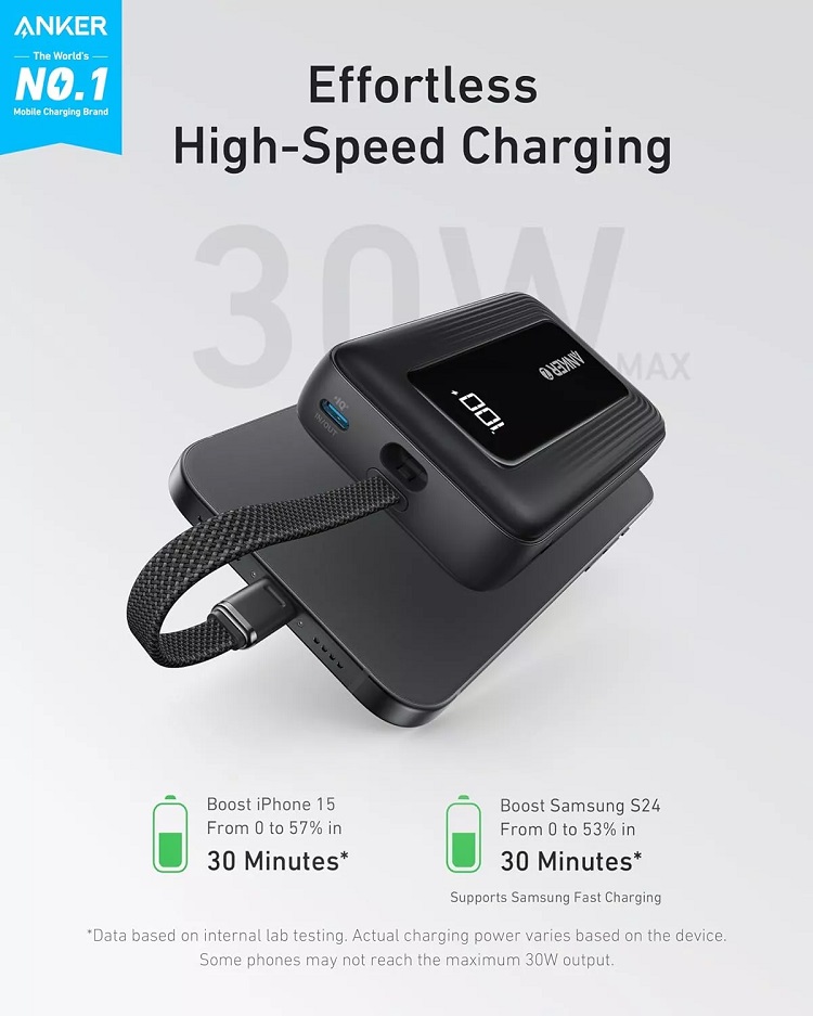 Bucura-te de o incarcare ultra-rapida pentru dispozitivele tale. Anker Zolo poate incarca un iPhone 15 de la 0 la 57% in doar 30 de minute, datorita tehnologiei sale de incarcare rapida de 30W. Cu o capacitate de 10.000 mAh, acumulatorul ofera pana la 2 incarcari complete pentru un iPhone 15 si aproape 2 incarcari pentru un Samsung S24. Dimensiunile reduse si greutatea optima il fac usor de transportat oriunde.
