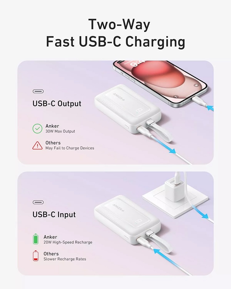 Echipat cu incarcare USB-C bidirectionala, acest powerbank asigura atat o iesire de pana la 30W, cat si o intrare rapida de 20W. Este compatibil cu o gama larga de dispozitive, inclusiv seria iPhone 16/15, MacBook, Galaxy, iPad, Nintendo Switch, Steam Deck si altele.