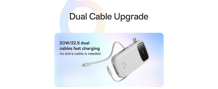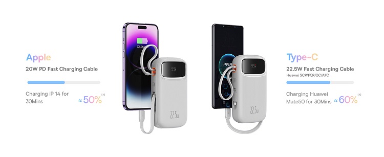 In plus, powerbank-ul are incorporat si un cablu USB-C si Apple Lightning cu care iti poti incarca dispozitivele si are o capacitate de incarcare de pana la 22,5 W. Aceasta inseamna ca dispozitivele precum iPhone 14 pot fi incarcate la aproximativ 50% in 30 de minute. Puteti citi procentul bateriei din powerbank pe afisajul digital.