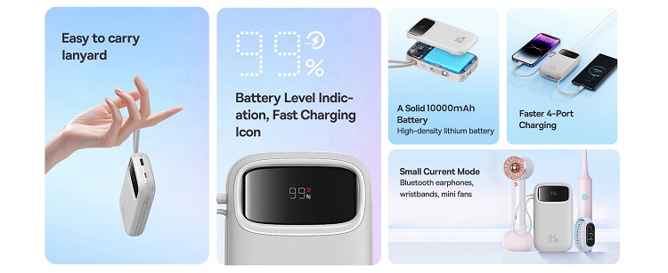 Acumulatorul extern QPow Pro+ de la Baseus puteti incarca pana la 4 dispozitive in acelasi timp. Bateria externa are o capacitate de 10.000 mAh si are un port USB si un port USB-C cu ajutorul carora poti incarca dispozitive precum telefonul sau castile wireless.