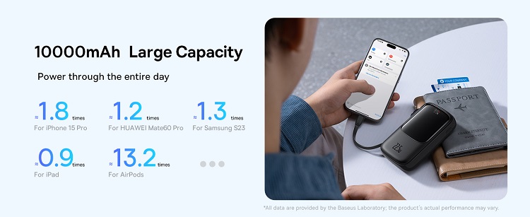 In ciuda dimensiunilor sale mici, powerbank-ul are o putere de pana la 22,5 W. Astfel, iti poti incarca dispozitivul mobil rapid si oriunde te-ai afla. Potrivit Baseus, folosind portul USB-A poti incarca, de exemplu, smartphone-ul Huawei Mate 60 Pro la 52% in 30 de minute.